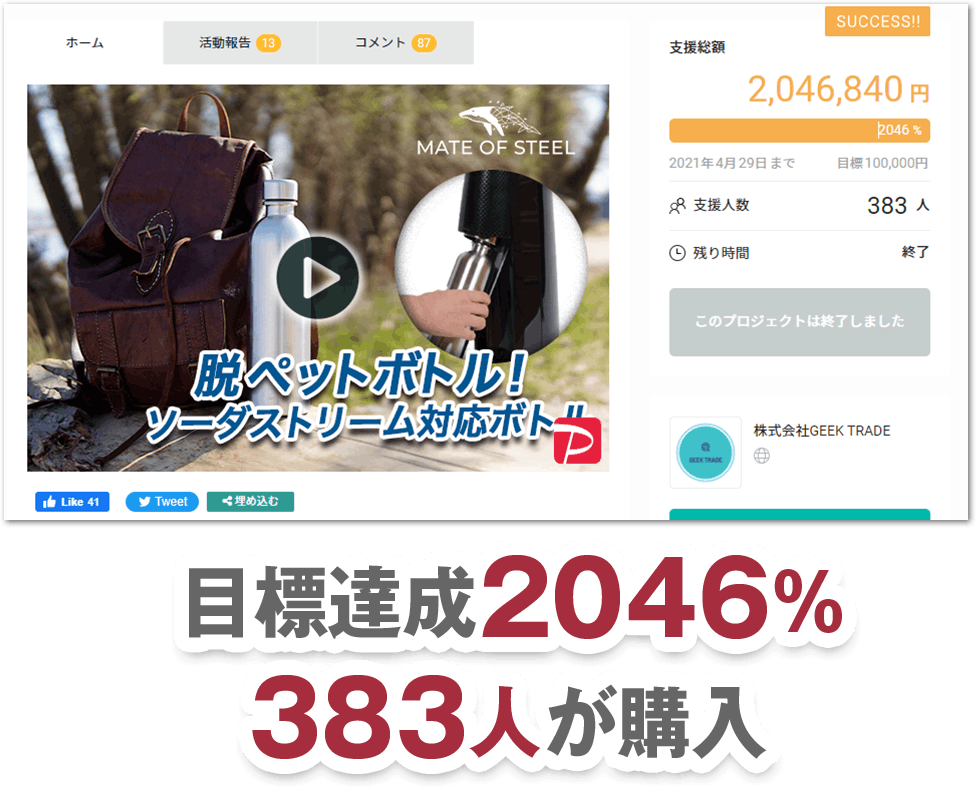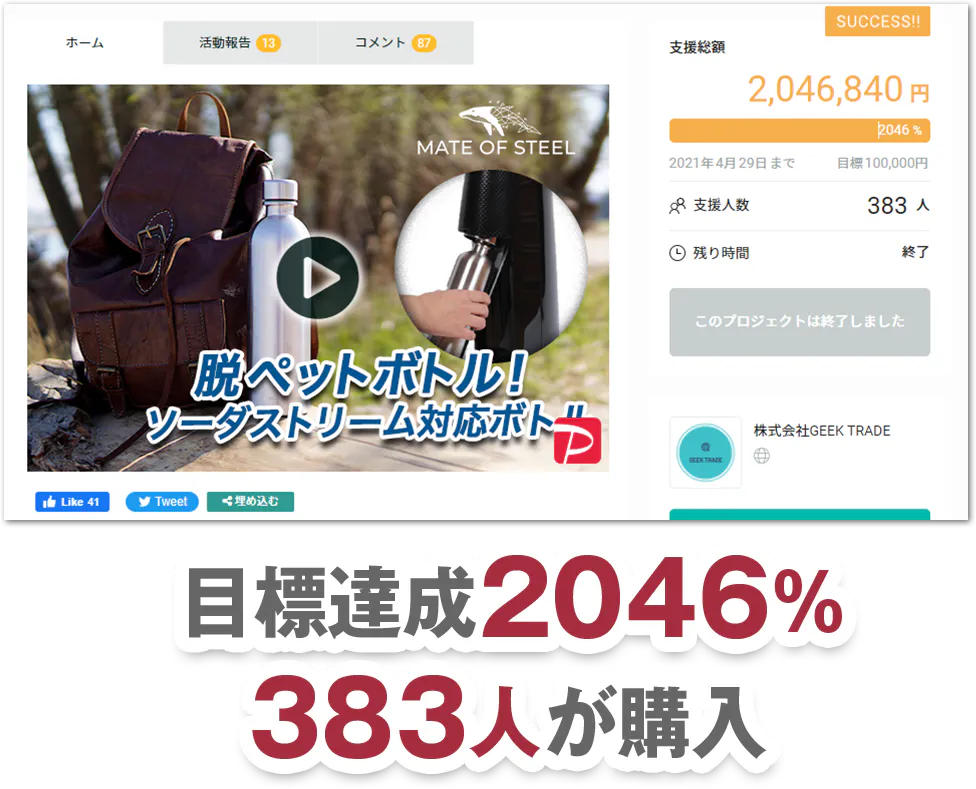 昨年、Greenfundingで目標達成2046%・383人が購入した人気ボトル【MATE OF STEEL】