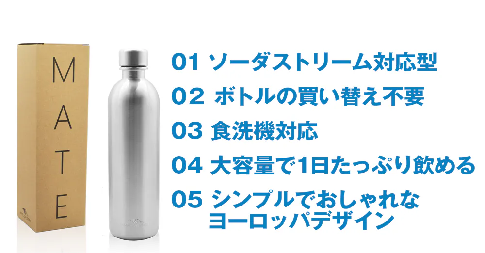 そんな現状を変えるためには、まず私たちにとって身近なペットボトルの使用量を変えなくてはなりません。 MATE OF STEELはシンプルで洗練されたデザインと、その軽さ、そして世界各国で販売されているSodaStreamに適応しているという点で、多くの人の生活にぴったり合った商品です。 ぜひ、MATE OF STEELで、快適な生活を楽しんでください。