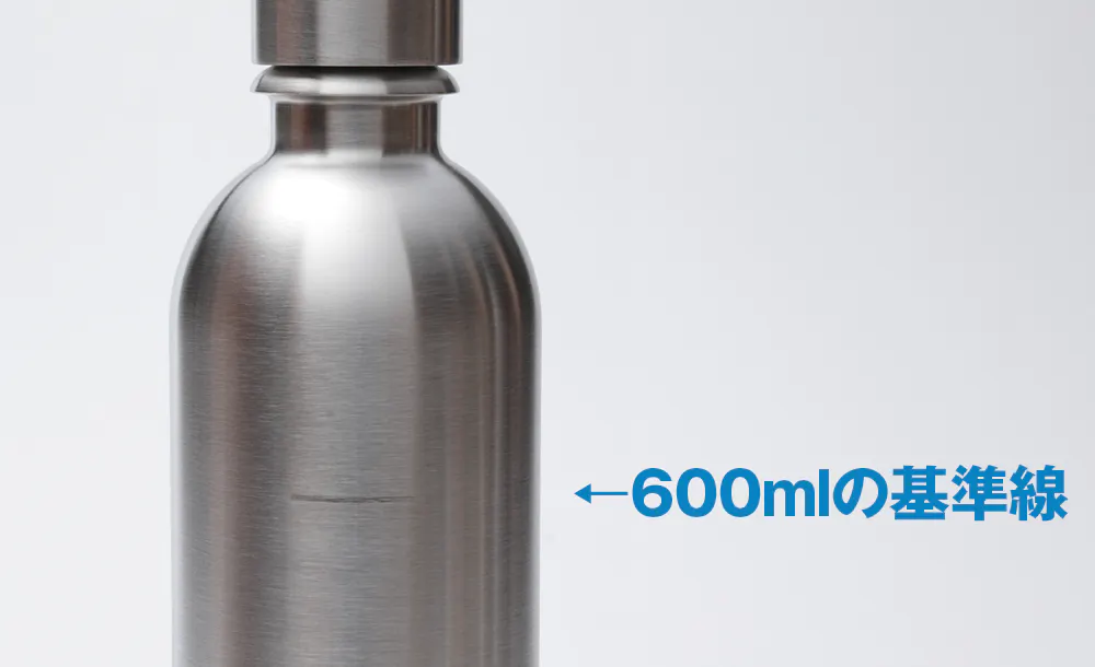 最大スパークリング量とは、炭酸水を作る際にボトルに入れることが出来る最大水量のことです。この量を超えて炭酸を注入すると、ボトルから水が溢れる可能性があるので、ご注意ください。また、強めの炭酸水を作った後に、水を加えることで、ボトルを炭酸水で満タンにすることができます。ボトルの外側に600mlの基準線もありますので、ご参考ください。