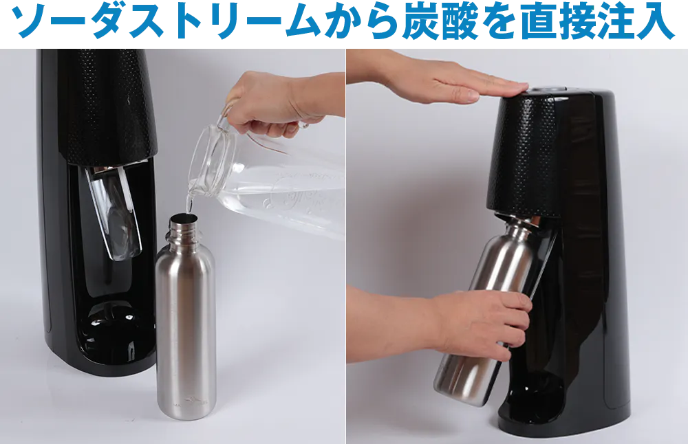 MATE OF STEELは家庭用の炭酸水製造機「ソーダストリーム」に対応したステンレスボトル。
