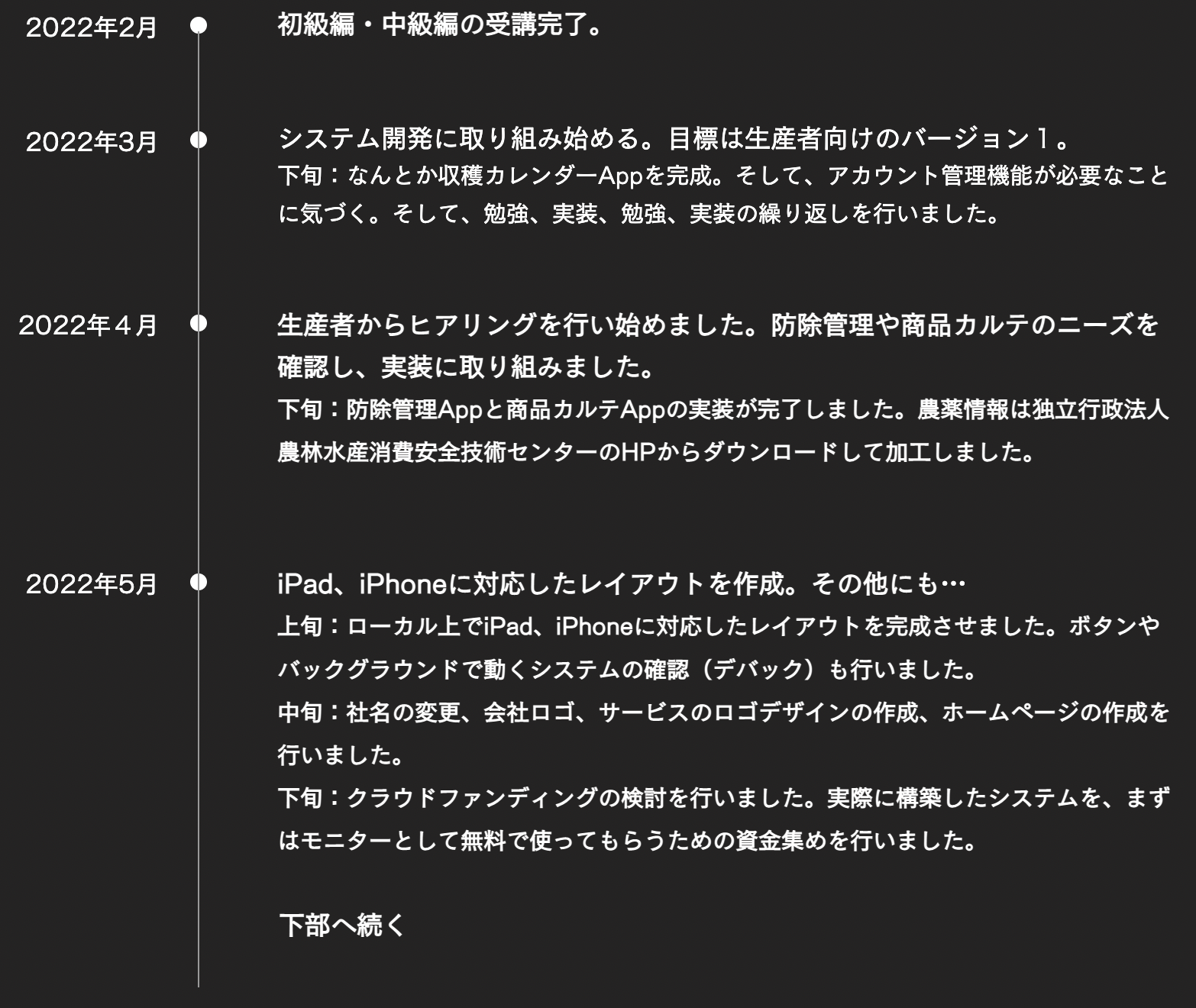 2022/06/30 15:10クラウドファンディング、無事に達成しました!!!とっても嬉しいです!今朝、身近な人に最後のお知らせをしたらみんな後からやろうと思ってたみたいで、なんだかんだでギリギリの最終日(笑)お知らせしていてよかった!笑来月からますます、活発に動けます!進捗はFacebookを中心に行います!よかったら、「テックベジタス」にいいね!してチェックしてただけると嬉しいです!!!繰り返しになりますが、、、この資金を活用してこの生産情報共有システムを【無料】で多くの農家に配ることができそうです。※一部の機能を有料化して収益を確保します。※現状、iPhoneのみ対応。協同組合はiPad/iPhone対応。農家が無料で使える機能は下記の通りです!1農業経営計画書作成2栽培日誌作成(施肥管理・作業管理・防除管理)3収穫カレンダー作成4商品カルテ作成5熱中症アラート※6お天気情報(積算温度計、旧暦など)※※未実装でこれから開発します♪農家の対象範囲はこちらです!「沖縄県で経営する農業経営者なら誰でも無料★」・農業生産法人・一般農家・家庭菜園愛好家・農業協同組合こちらからテスト版の申し込みが行えます!https://forms.gle/aYwYxtcLUBYMymVQ7〜〜〜〜 今後の開発の予定です♪ 〜〜〜〜・7月〜 はるさー、組合にモニターシステム配布・8月〜 バイヤーにモニターシステム配布・10月〜 直売所、八百屋、仲卸業、加工業にモニターシステム配布※なお、開発の進捗具合によって時期がずれることがございます。 予めご了承下さい。※モニター利用希望者は、スムーズにご案内するために 下記のリンクより受付をお願いいたします。※システムサポートの観点からモニター募集は県内事業者に限らせていただいております。〜〜〜〜〜〜〜〜〜〜〜〜〜〜〜〜〜〜〜 もっと見る
