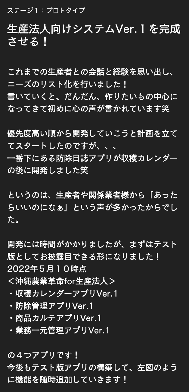 2022/06/29 19:37いよいよ、明日で最後★これまでご協力、誠にありがとうございました!!クラウドファンディングを通して、新しい出会いや、アドバイスがありました♪補助事業の申請も昨日で提出してきたのですが、これもクラファンによる宣伝をキッカケに知人が「こんなのもあるから申請してみたら?」ということで知ることができました!しかも、期限ギリギリに提出できました笑さて、おかげさまで、この資金を活用してこの生産情報共有システムを【無料】で多くの農家に配ることができそうです。※一部の機能を有料化して収益を確保します。農家が無料で使える機能は下記の通りです!1農業経営計画書作成2栽培日誌作成(施肥管理・作業管理・防除管理)3収穫カレンダー作成4商品カルテ作成5熱中症アラート※6お天気情報(積算温度計、旧暦など)※※未実装でこれから開発します♪農家の対象範囲はこちらです!「沖縄県で経営する農業経営者なら誰でも無料★」・農業生産法人・一般農家・家庭菜園愛好家こちらからテスト版の申し込みが行えます!https://forms.gle/aYwYxtcLUBYMymVQ7〜〜〜〜 今後の開発の予定です♪ 〜〜〜〜・7月〜 はるさー、組合にモニターシステム配布・8月〜 バイヤーにモニターシステム配布・10月〜 直売所、八百屋、仲卸業、加工業にモニターシステム配布※なお、開発の進捗具合によって時期がずれることがございます。 予めご了承下さい。※モニター利用希望者は、スムーズにご案内するために 下記のリンクより受付をお願いいたします。※システムサポートの観点からモニター募集は県内事業者に限らせていただいております。〜〜〜〜〜〜〜〜〜〜〜〜〜〜〜〜〜〜〜以上です!クラウドファンディングが終わっても、引き続き、SNS等で進捗を報告してきたいと思います!これからも、どうぞよろしくお願いたします! もっと見る
