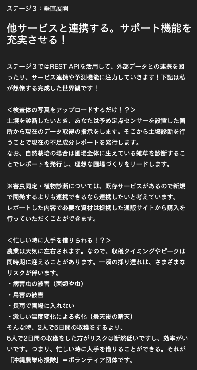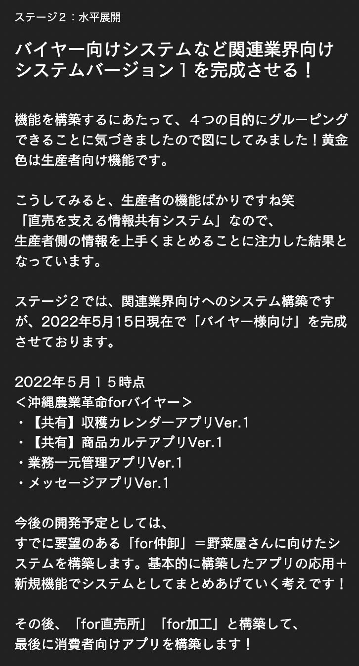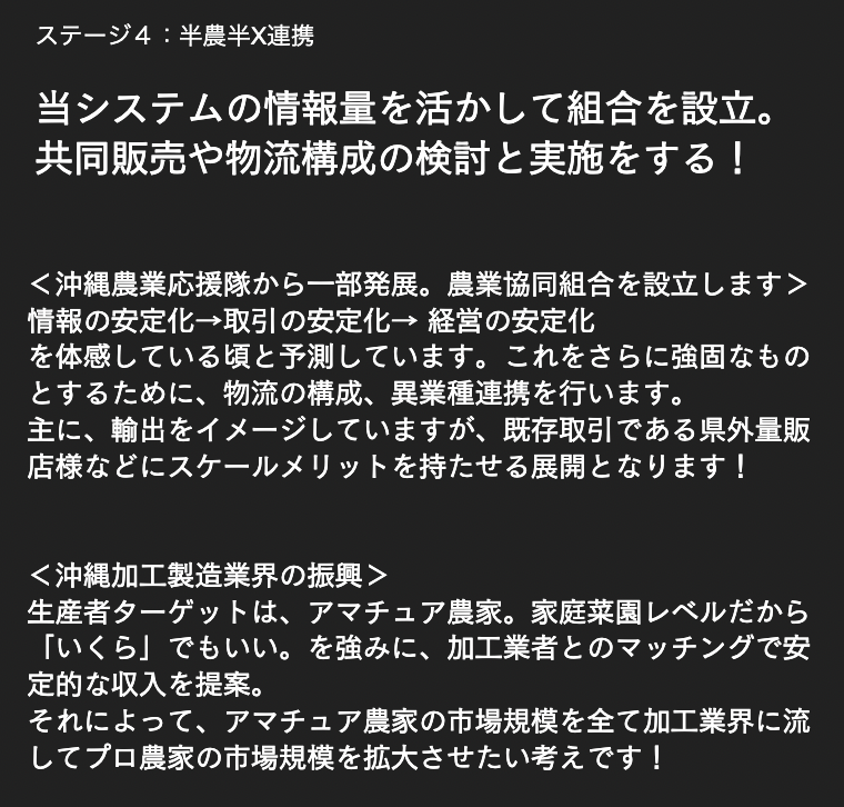 今の沖縄農業には、有機的な繋がりがまだ足りないと感じているので、それをこのシステムで解決し、この世界観の実現に向けてチャレンジします。