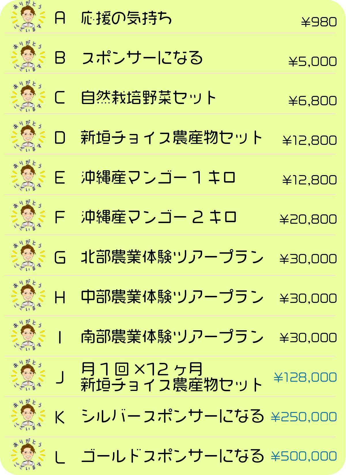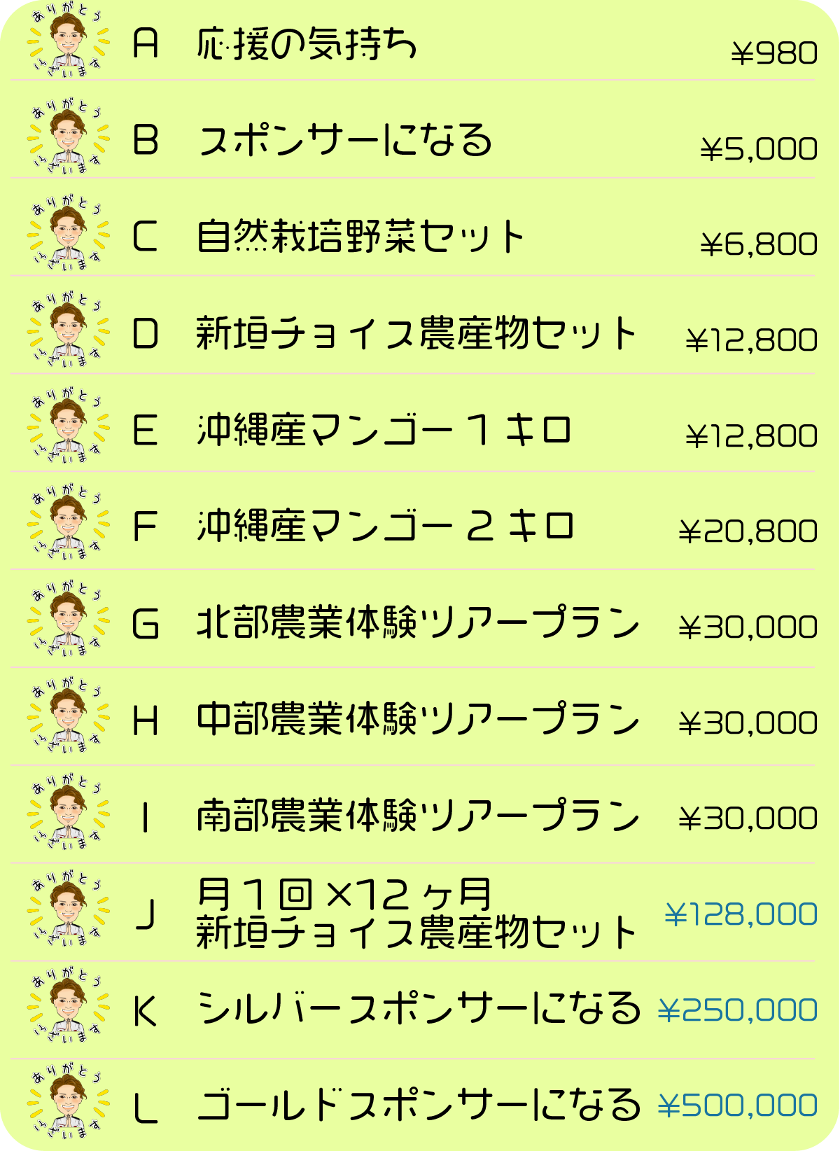 リターンには、生産者からの農産物セットやマンゴー、本システムのスポンサー広告などのコースを用意しましたので、是非ご覧ください。