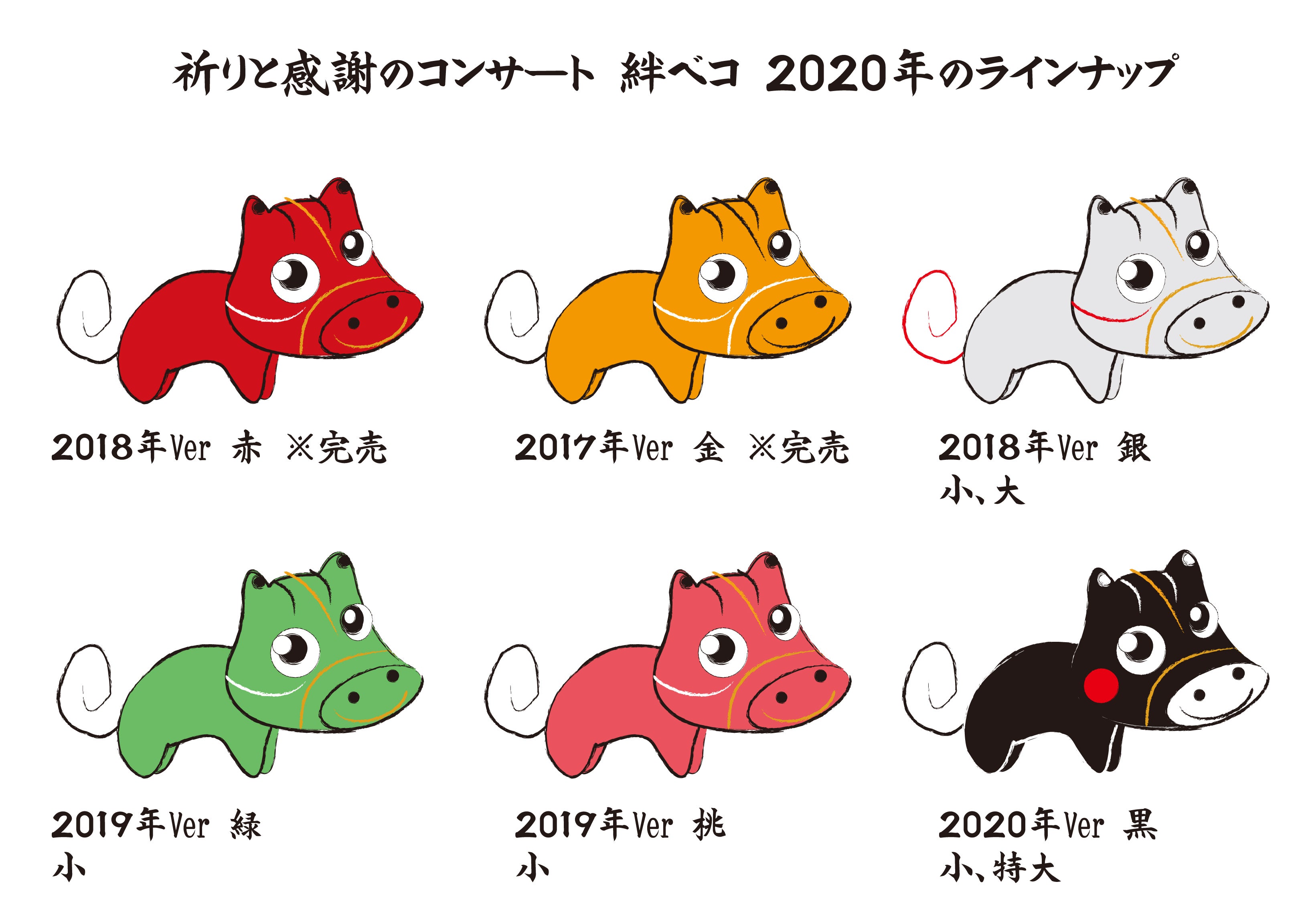 絆ベコ企画は、福島県会津若松市の荒井工芸所様のご協力のもと、2016年から2019年までで累計400体以上もの絆ベコが会場に並び、皆様からのたくさんのメッセージが会場に並びました。毎年色を変えながら、赤・金・銀・桃・緑・黒の絆ベコが誕生しました。