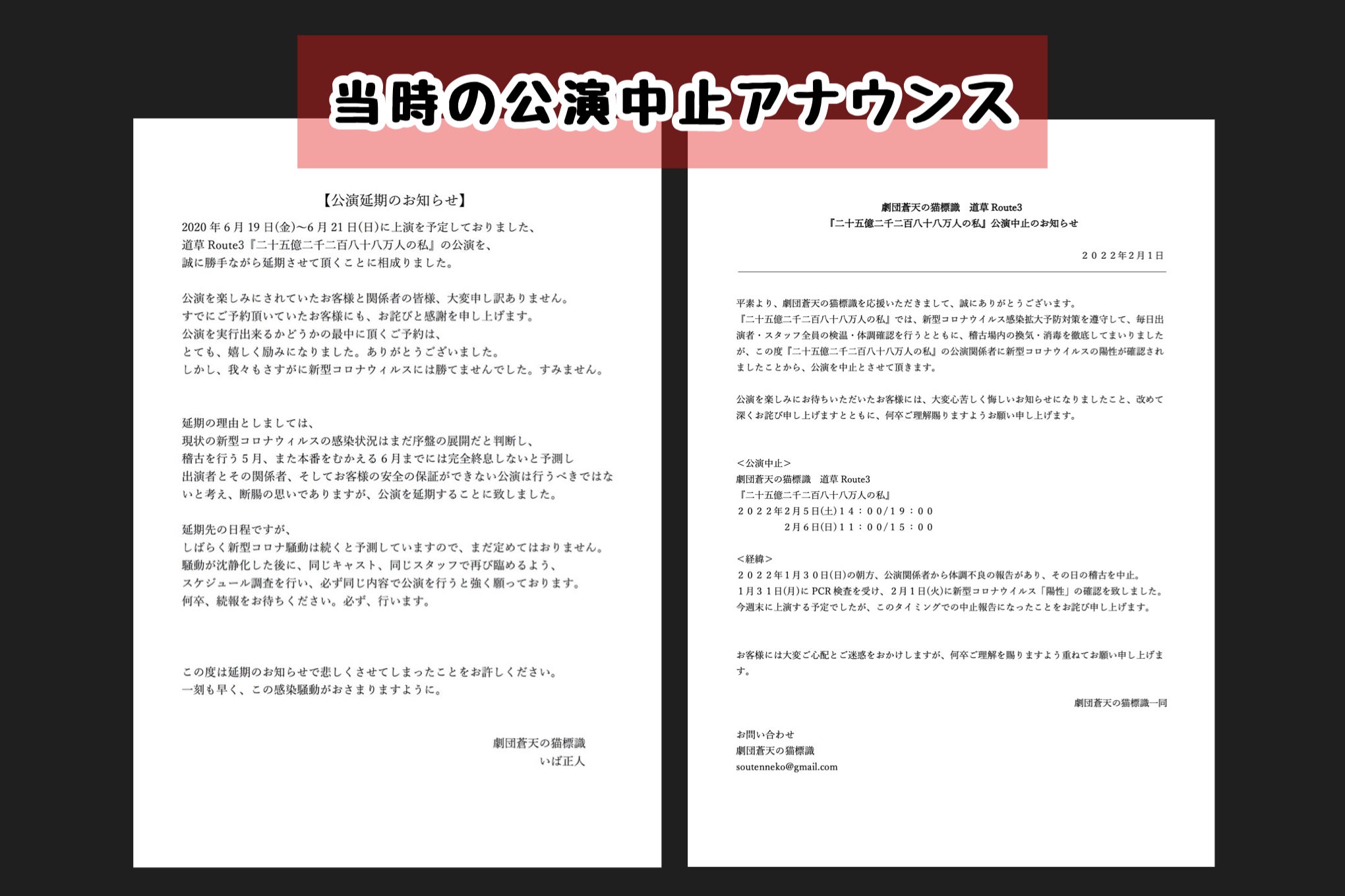 2020年6月に上演する予定でしたが、未知のウイルスの発現、ステイホームの発令により一度中止。その後、2022年2月に再び上演を計るも公演関係者に陽性者を確認。