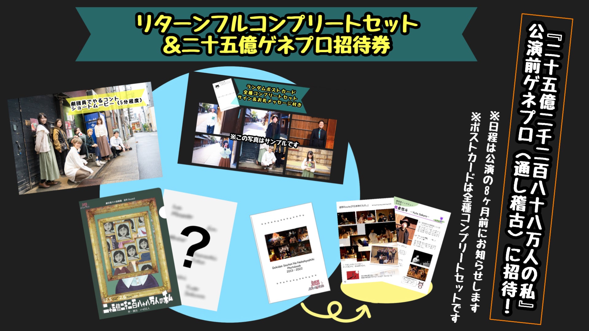20000円のご支援ではフルコンプリートセットに加え、ゲネプロ招待券が付きます。