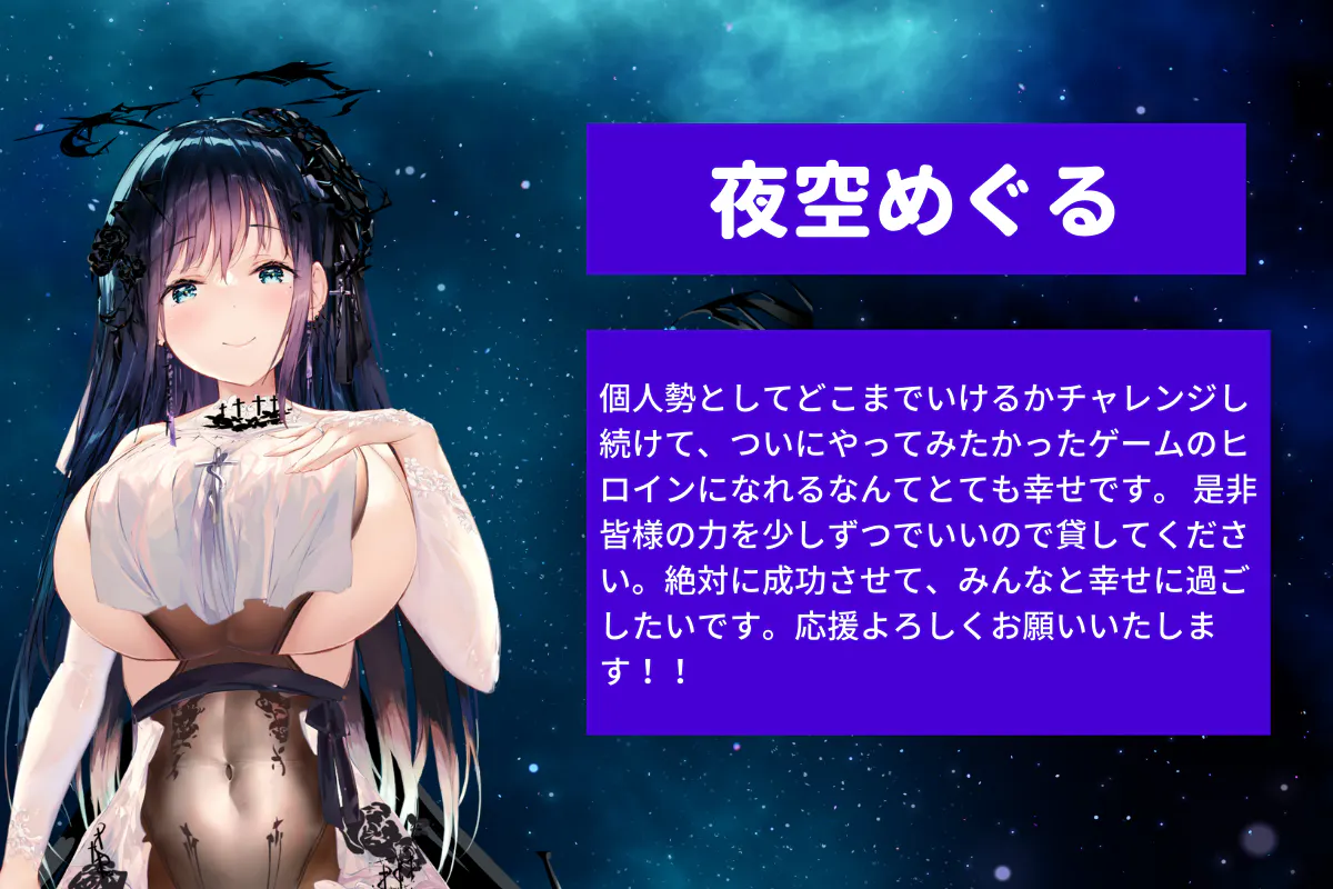 現在は、メインヒロインの4名(星乃すな、聖々良しきの、夜空めぐる、蜜咲姫 朱)のみ攻略ルートがあります。しかし、ストレッチゴールご支援額170%超え(170万)でエキストラ攻略ルートを制作します!
