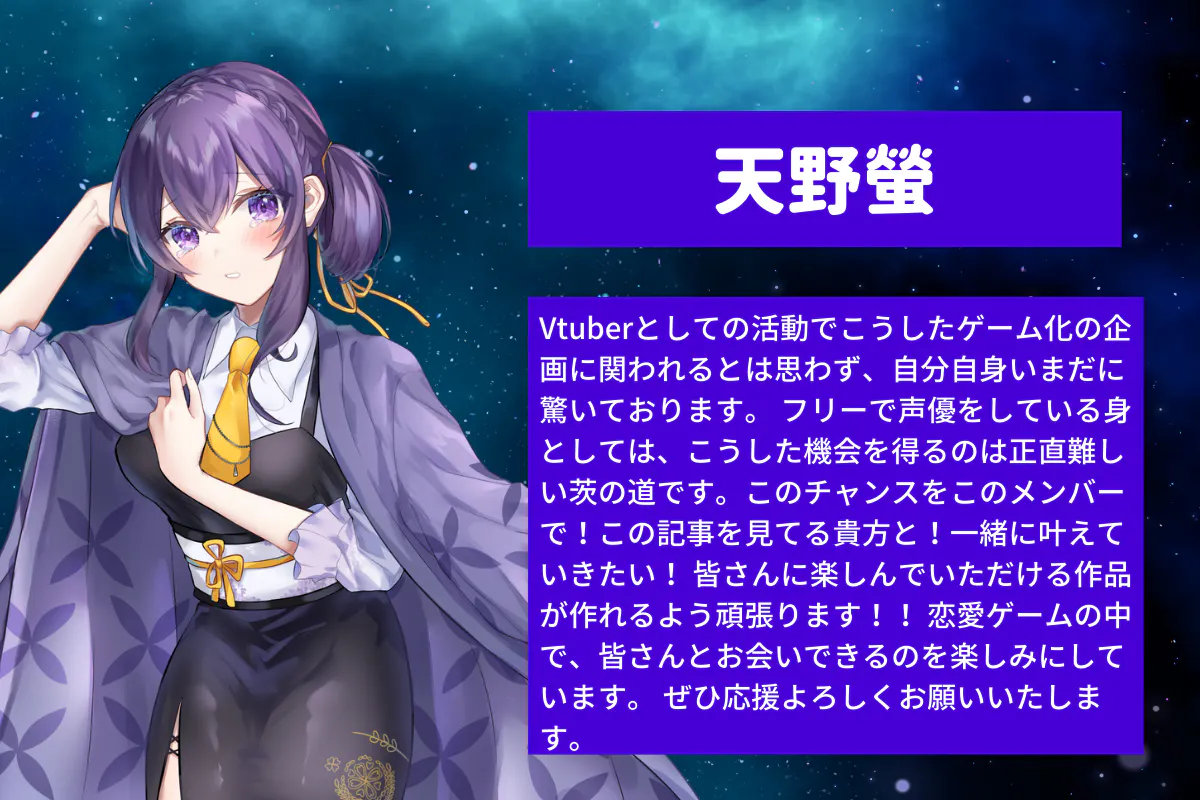 いずれは、より多くのVtuberと1対1でコミュニケーションできるノベルゲームを作っていきたいですね。
