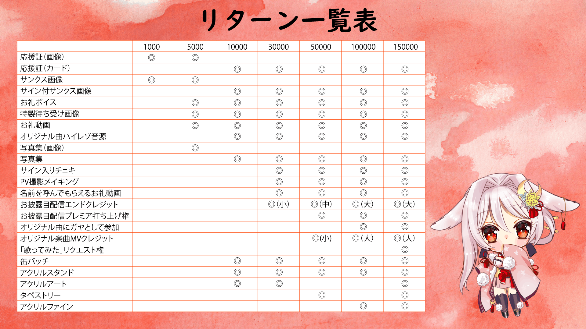 ふー…ながかった…。以上がリターン品の説明となりまする!