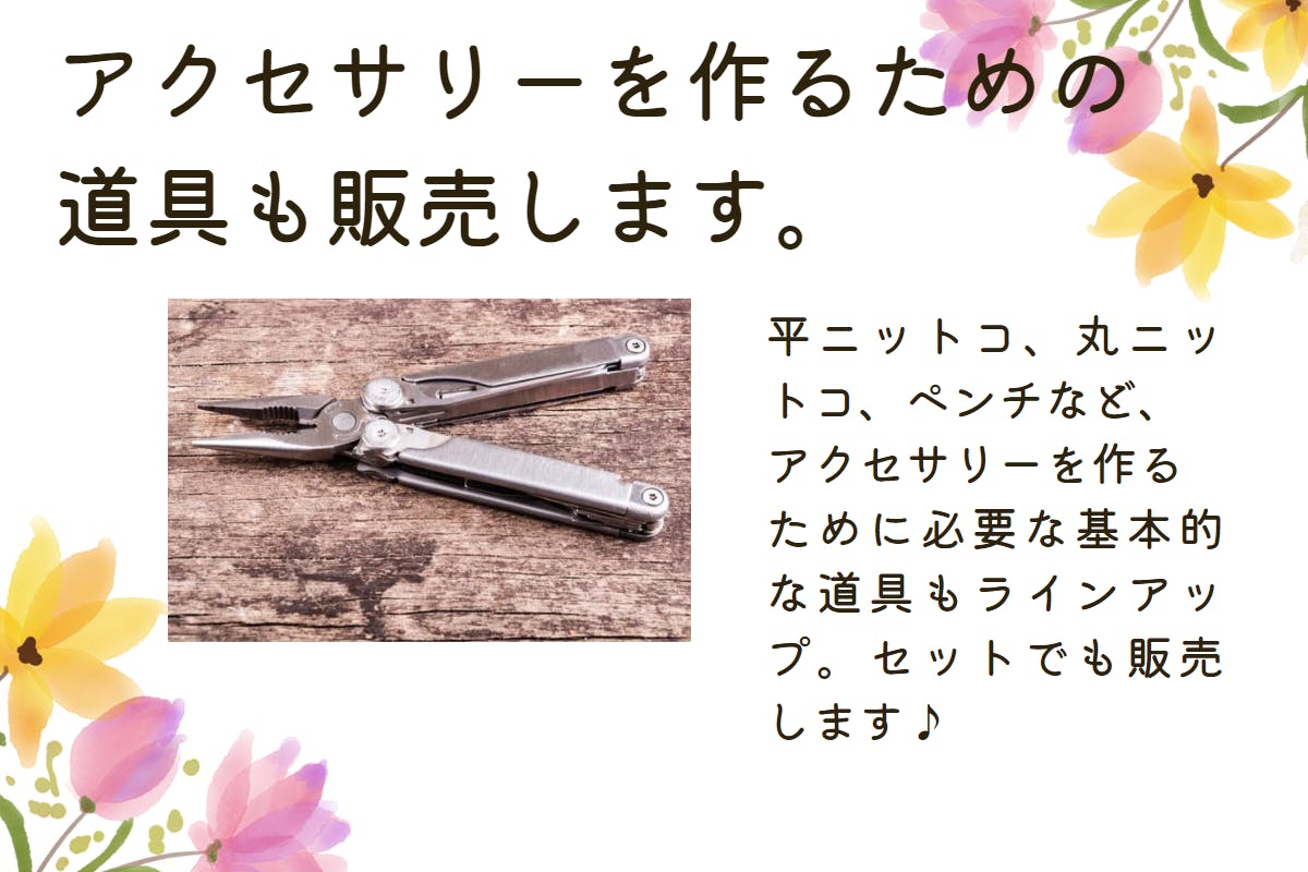 アクセサリーを作ると言っても、道具がないとどうにもなりません。nanaleafでは、平ヤットコ、丸ヤットコ、ペンチなど、これがないと困る!という基本的な道具をラインアップします。初心者の方がまずは試せるセット販売も行う予定です。