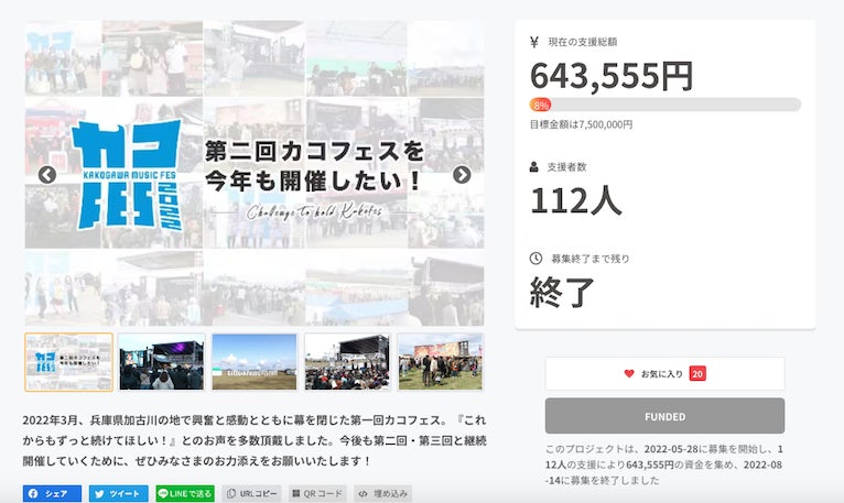 5月28日(土)よりチャレンジしておりましたクラウドファンディングが、8月14日(日)に終了いたしましたので、ご報告させていただきます。今回、目標金額には届きませんでしたが、112名の方々にご協力いただき、643,555円という金額で終了いたしました。ご支援いただきました皆様へ、カコフェス実行委員一同、心より御礼申し上げます。また、期間中、様々な励ましのお言葉をお寄せいただいた皆様、今回のプロジェクトについてSNS等で幅広くお声かけしていただいた皆様にも、あわせて御礼申し上げます。また、順次リターンの対応をしていきますので、今しばらくお待ちくださいませ。出演アーティストなど、今後の情報につきましては、公式サイト、Facebook、Twitter、Instagramにて発信していきますので、フォローなどをしてご覧いただけますと幸いです。皆様のご期待に添えますよう、実行委員一同、精一杯頑張ってまいりますので、引き続き応援いただけますよう、よろしくお願いいたします。この度はご支援、ご協力いただき、ありがとうございました。