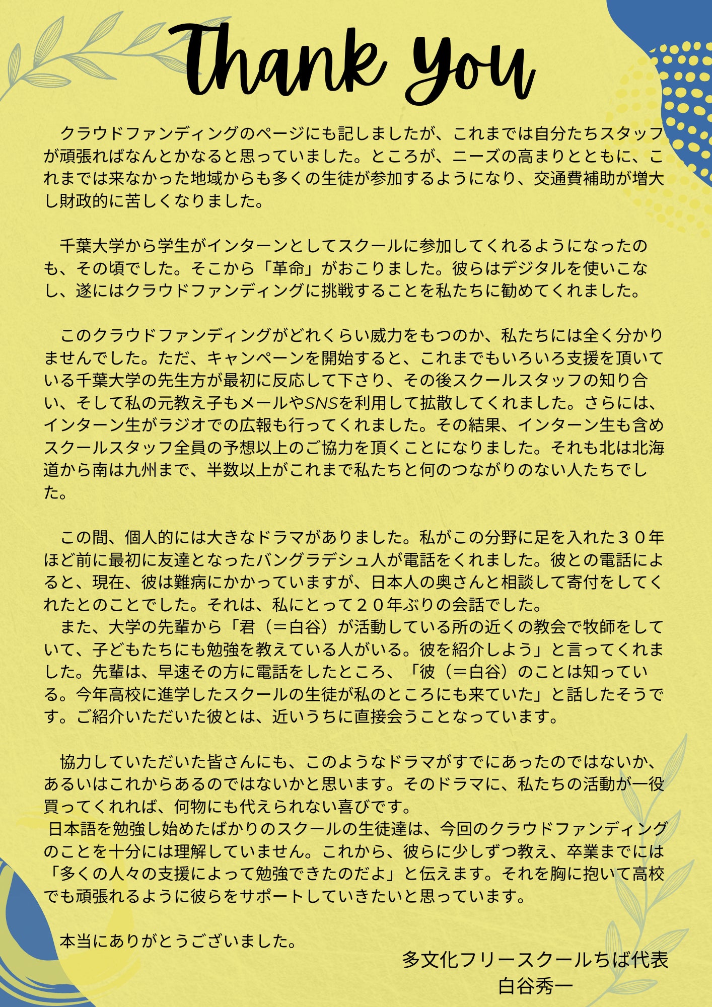 これからの多文化フリースクールちばの活動に続けてご支援いただけますよう、お願いいたします。