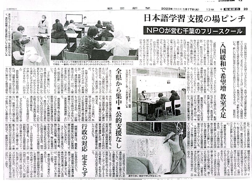 2023/03/17 08:00みなさん、こんにちは。多文化フリースクールちばです!先日掲載された1/15朝日新聞朝刊に加え、朝日新聞千葉版や産経新聞で多文化フリースクールちばが取り上げられました!今回の活動報告では、3つの新聞記事をご紹介させていただきます!1.日本語学習 支援の場ピンチ(朝日新聞)こちらの記事では、私たちが高校入試を目指す、外国にルーツを持つ子どもたちの学習支援を行なっている理由や、子どもたちのためにスクールを運営する上で直面している問題、特に今解決が急がれているスクール移転先の問題などについて書かれています。こちらのリンクから新聞記事のPDF版を読んでいただけます↓https://drive.google.com/file/d/1DISbCFIqZDeJ85JSgnzDdet28pN9Kp-X/view?usp=sharing2.千葉市の公立夜間中、今春開校 「進学し就労が夢」アフガニスタン人ら(朝日新聞)この記事では、今春から千葉市内に開校される公立夜間中学校についてや、外国につながる子どもたちが夜間中学校への進学を希望する理由についてなどが書かれています。オンライン版の記事はこちらのURLから↓千葉市の公立夜間中、今春開校 「進学し就労が夢」アフガン人ら:朝日新聞デジタル (asahi.com)3.千葉市のNPO法人苦境(産経新聞)この記事では、日本への入国制限緩和により、多文化フリースクールを含む多くの施設が逼迫していることが、白谷秀一代表へのインタビューとともに書かれており、さまざまな課題について皆様にご理解していただけるかと思います。こちらのリンクから新聞記事のPDF版を読んでいただけます↓https://drive.google.com/file/d/1VQu58-d4SbJ7cOC-nYB_pUuZ0UDH4T-F/view?usp=sharing少しずつ新聞に取り上げられるようになり、日本社会の「はざま」におかれながらも日々一生懸命に勉強している子どもたちや、彼らを支える多文化フリースクールちばの存在が多くの人に知られるようになってきたのでないかと、嬉しく思っています。より多くの人に私たちのことを知っていただけるように、私たちの活動にご賛同いただけるように、これからも頑張っていきます。暖かく見守っていただけると嬉しいです! もっと見る