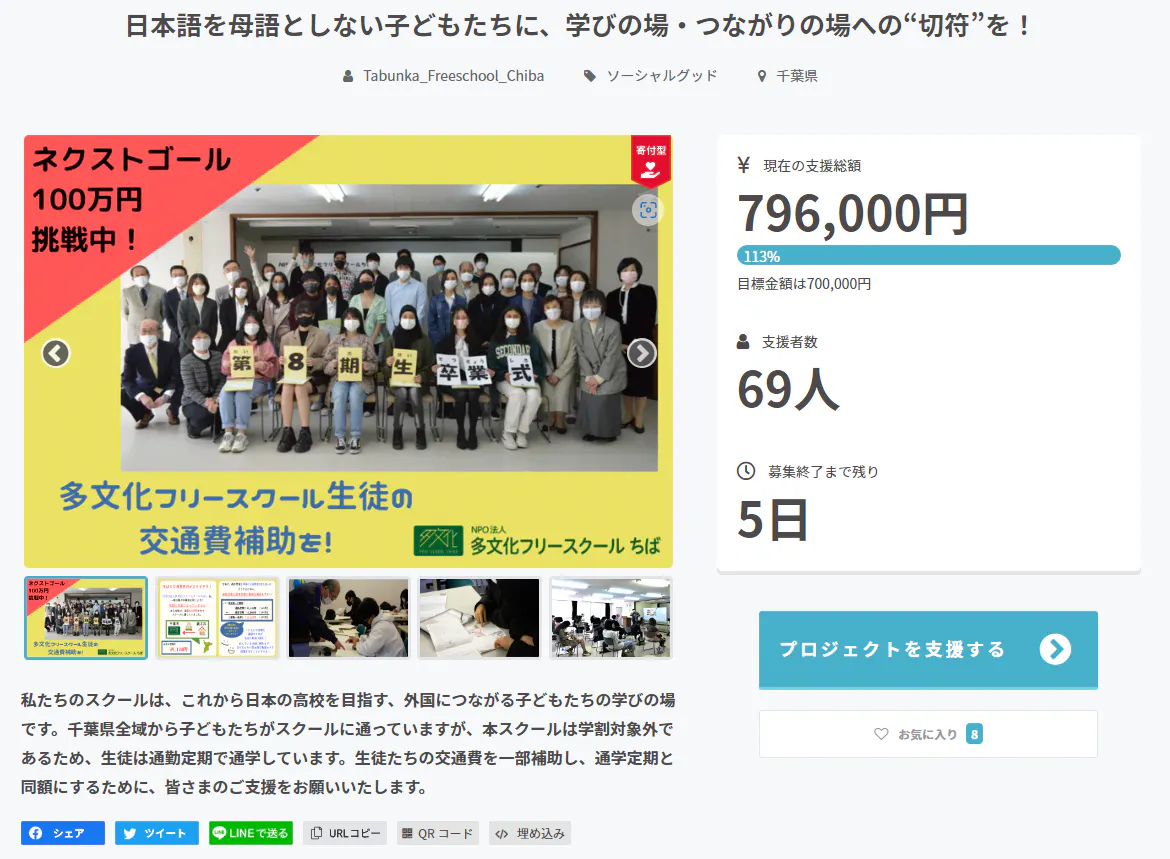 現在、69人の方から796,000円のご支援をいただき、目標金額の113%に到達しています!6/15に目標金額の70万円を達成してから10日経ちましたが、100万円というネクストゴールに向けて、多くの方が引き続き寄付をしてくださり、非常に嬉しいです!