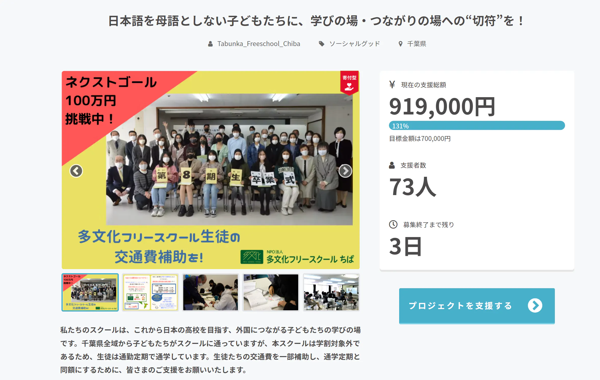 現在、73人の方から919,000円のご支援をいただき、目標金額の131%に到達しています!ネクストゴール100万円に向けて、多くの方が引き続き寄付をしてくださり、ネクストゴールも達成直前まで来ております!