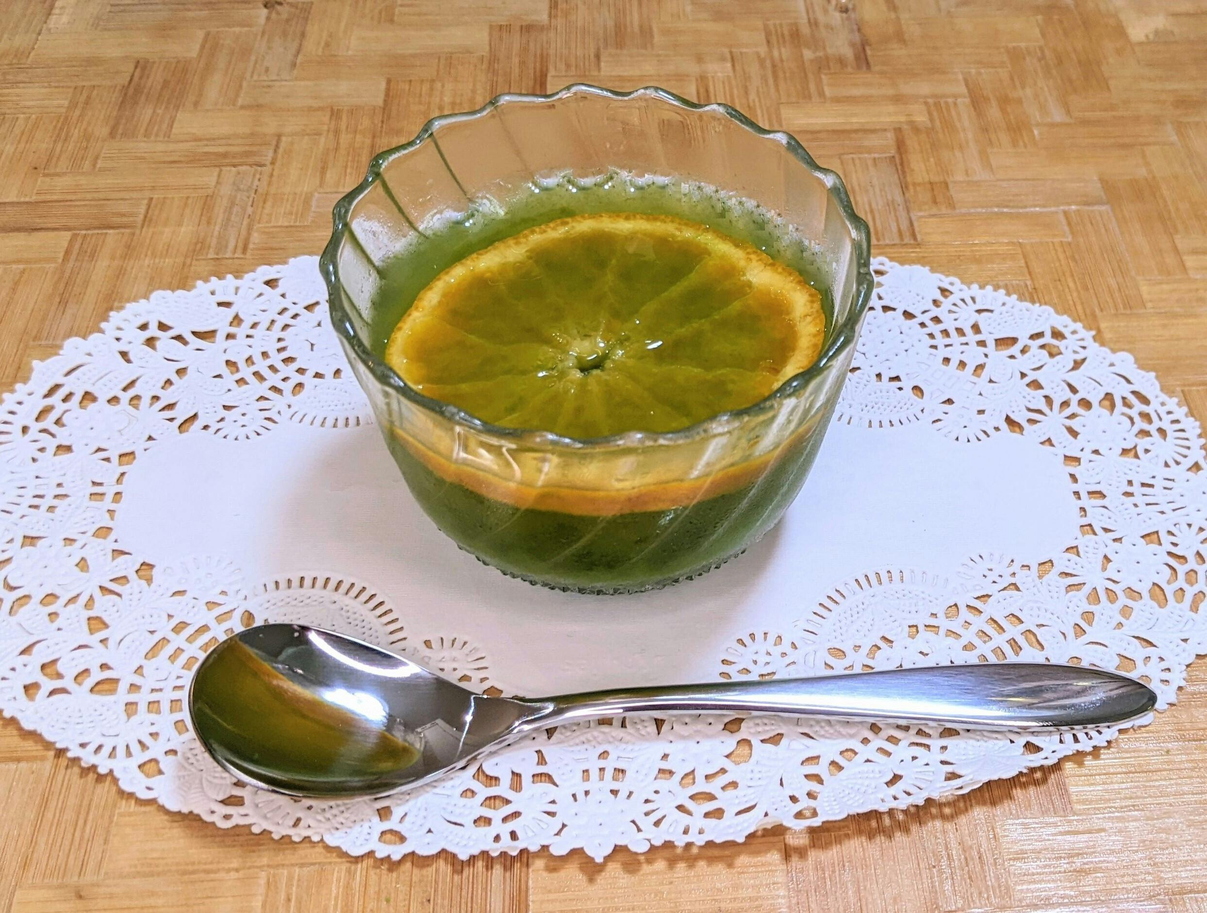 暑いときには、冷やした抹茶オレンジゼリーで、のど(喉)とのう(脳)を冷やして、のどかな気分になりませんか? Oh No! (#^^#)