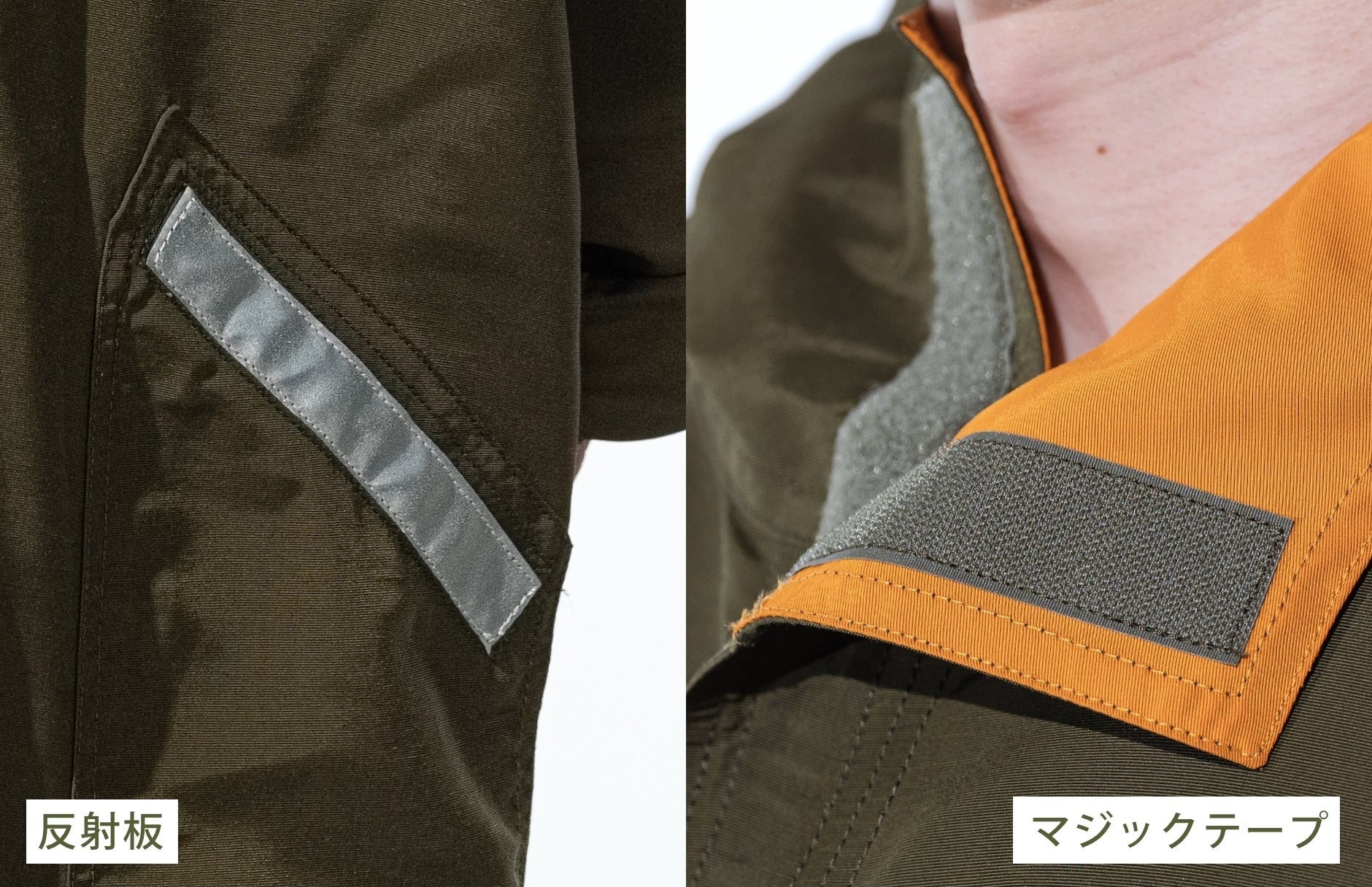 ▶︎生地は難燃・はっ水素材の「炎神」を使用。縫製時に使用するマジックテープ・反射板も難燃素材を使用