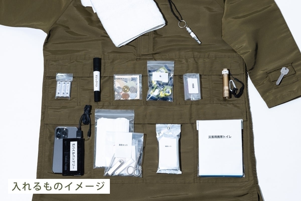 たくさんのポケットと難燃・はっ水素材でできているprepoverは、防災の備えとしてだけでなく、アウトドアや作業着・レインウエアとしても活躍できます。