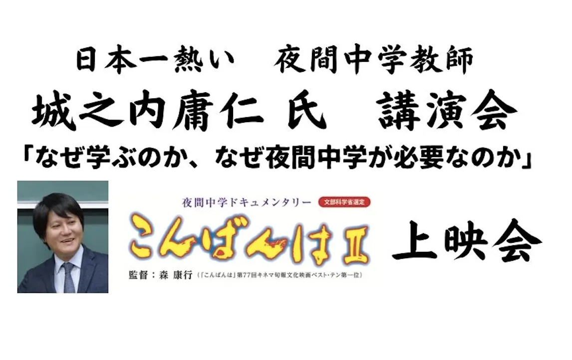 日本一熱い、夜間中学教師、城之内庸仁 氏 講演会、夜間中学ドキュメンタリー映画「こんばんはⅡ」上映会のお知らせ