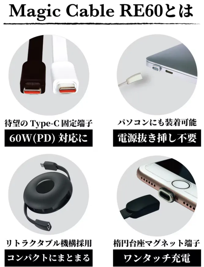 『Magic Cable RE60』は、アダプタ側がType-C(USB-C)となっており、60W対応の巻取タイプの充電ケーブルです。