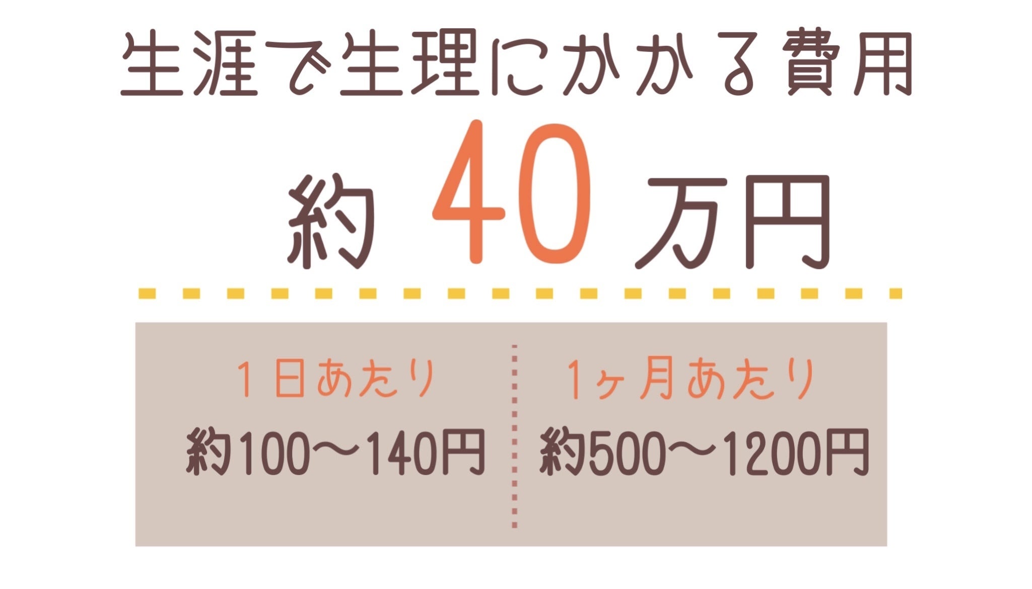 「生理用品はナプキンを使用」「2〜3時間ごとにナプキンを交換」「生理期間は5日間」「1〜3日目に鎮痛剤を使用する」と仮定すると、生理にかかる費用は1日あたり約100〜140円、1カ月あたり約500〜1200円で、生涯にかかる費用は約40万円という計算です。