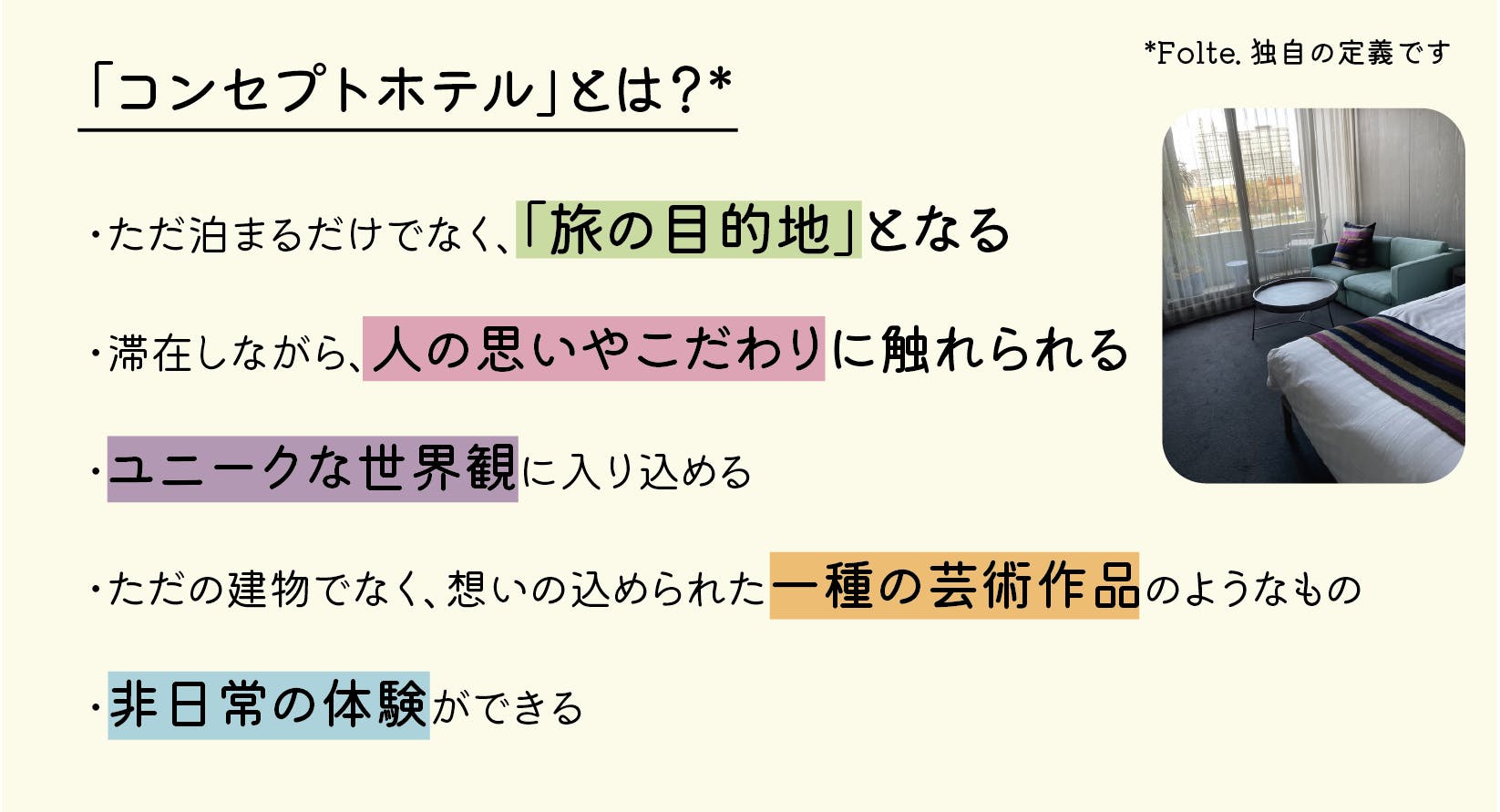 内容:Folte.がピックアップした全国150以上のコンセプトホテルのリスト。ホテル名や地域だけでなく、おすすめポイントやどんな人に合ったホテルかなども記載。