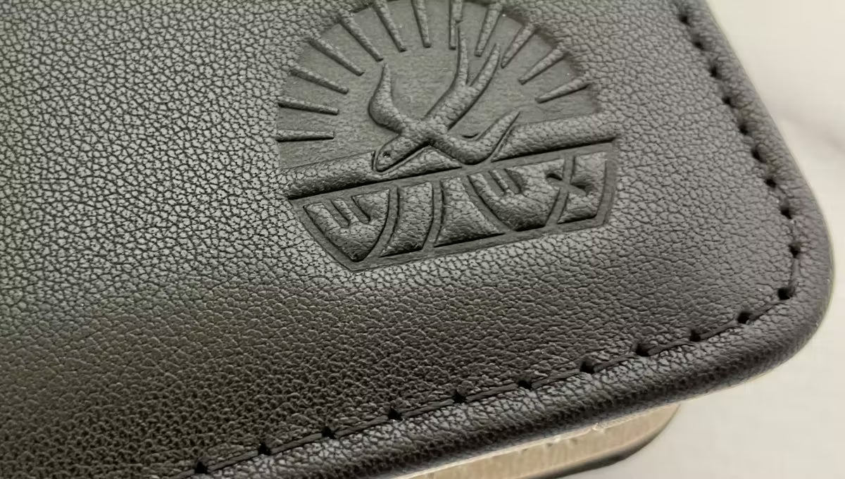 メインの素材はPUレザーとなります。耐久性や普段使いの扱いやすさも考慮いたしました。その中でもありきたりの表面加工ではなく、小さい菱形模様のエンボス加工を施したクロスグレイン素材を選びました。光の当たり方でも表情が変わりエレガントな印象の素材です。