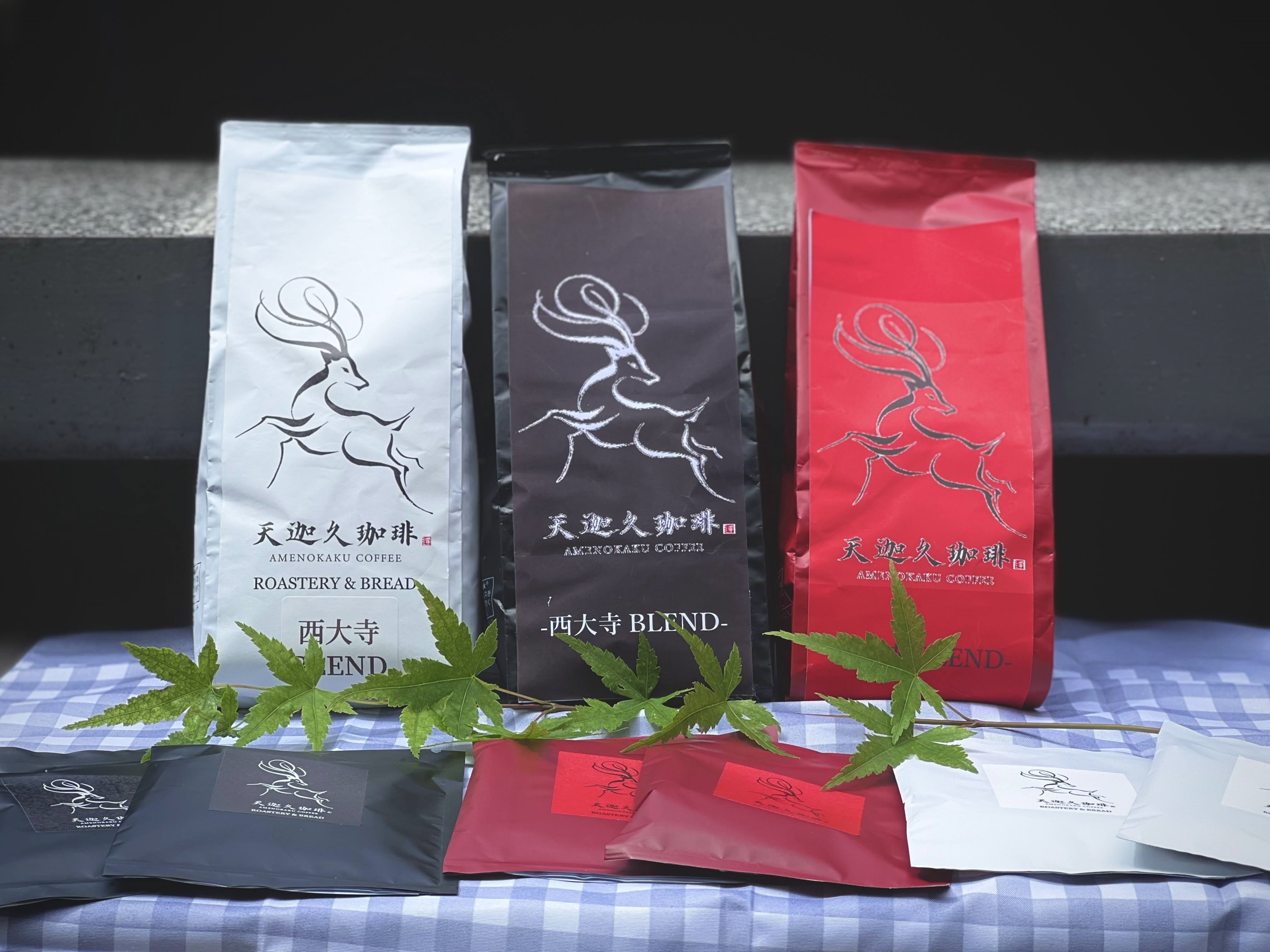 ご協力にあたり当店限定ブレンドを作っていただきました。黒はコク深く、赤は柔らかな酸味、白は両方の良さを兼ね備えた3種類のコーヒー。お店の味をぜひご自宅でお楽しみください。