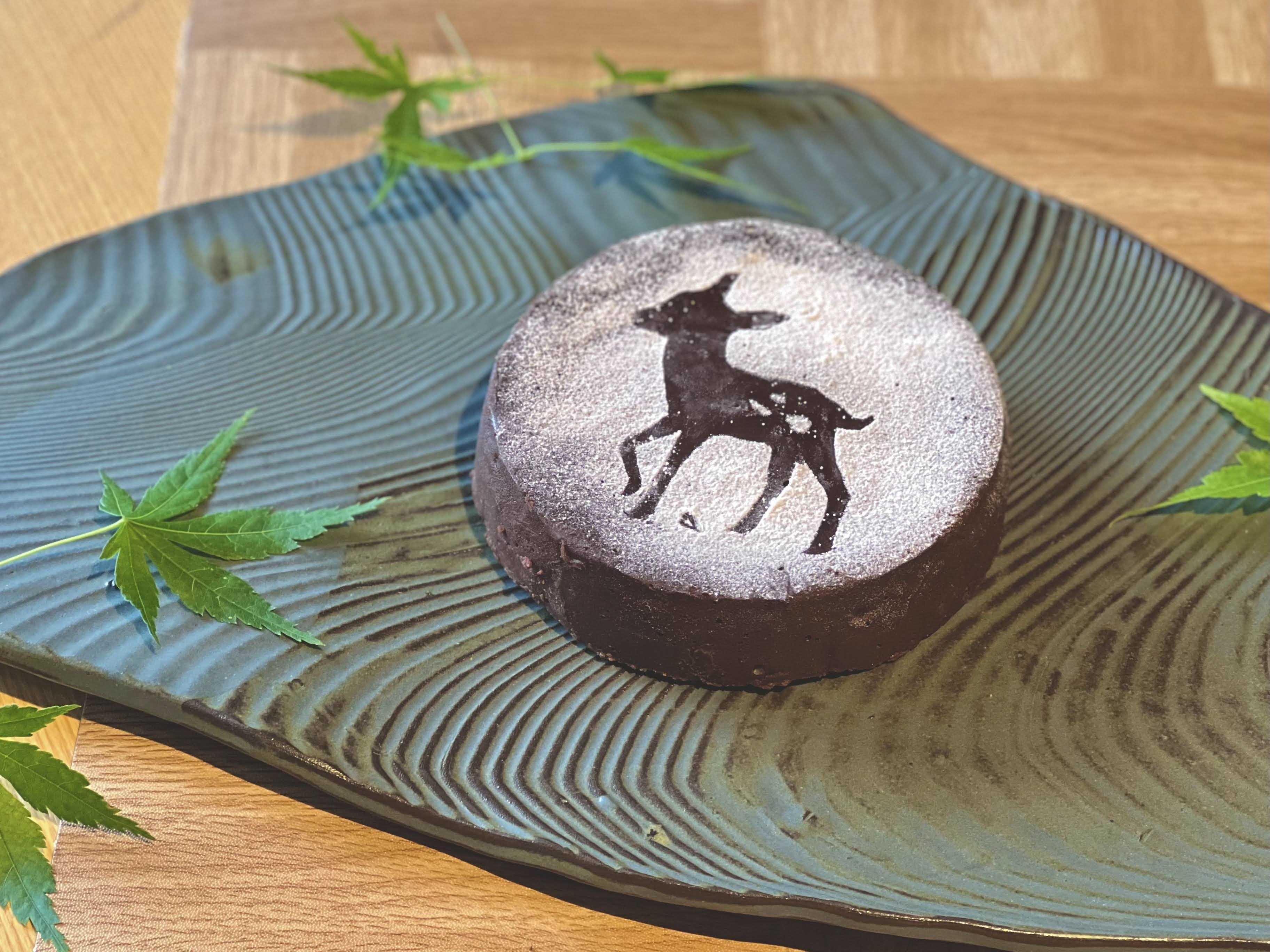 アクセントのナッツで奈良公園の草原に寝転ぶ鹿をイメージしたこちらの大和茶ガトーショコラ。