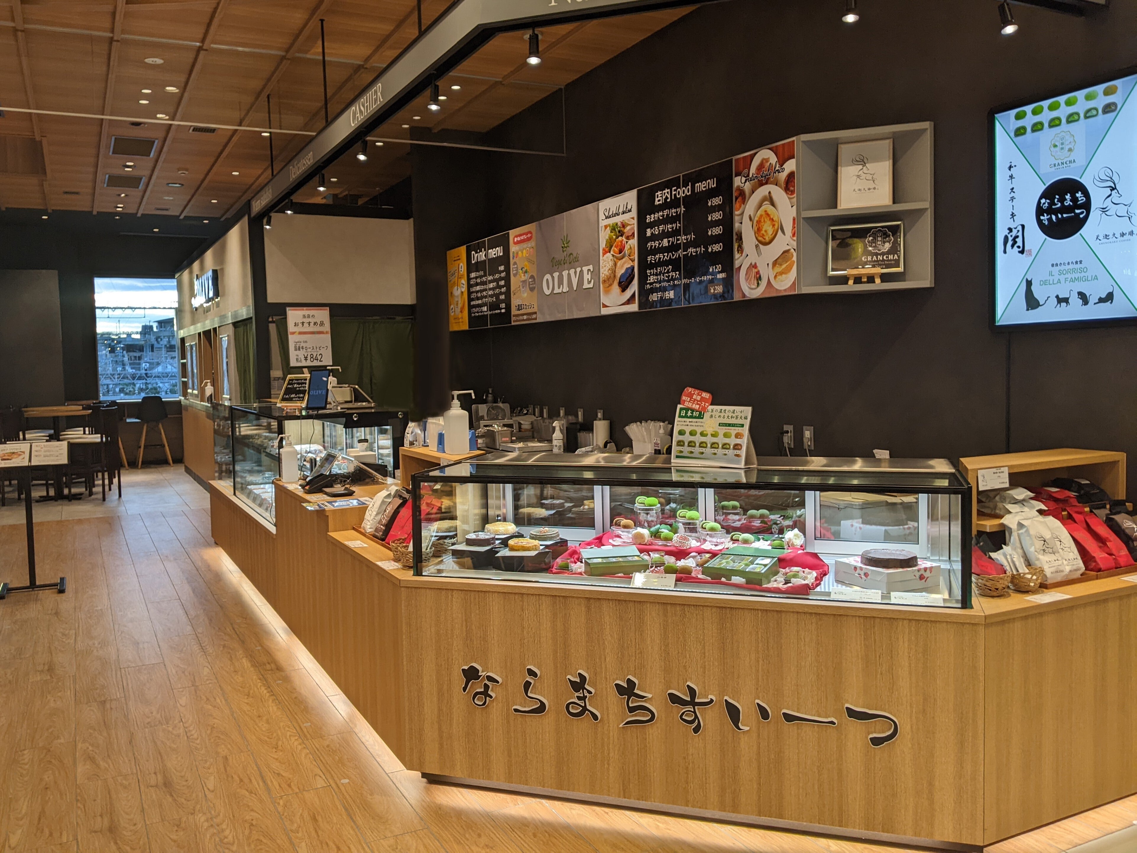 まずはこのケーキを携えて、奈良の主要のりかえ駅である大和西大寺駅ナカにて、「いつでも気軽にならまちスイーツが買えるお店」をコンセプトに、ならまちスイーツ専門コーナーを併設したデリカテッセン「Vege&Deli Olive」を今年3月にオープンしました。