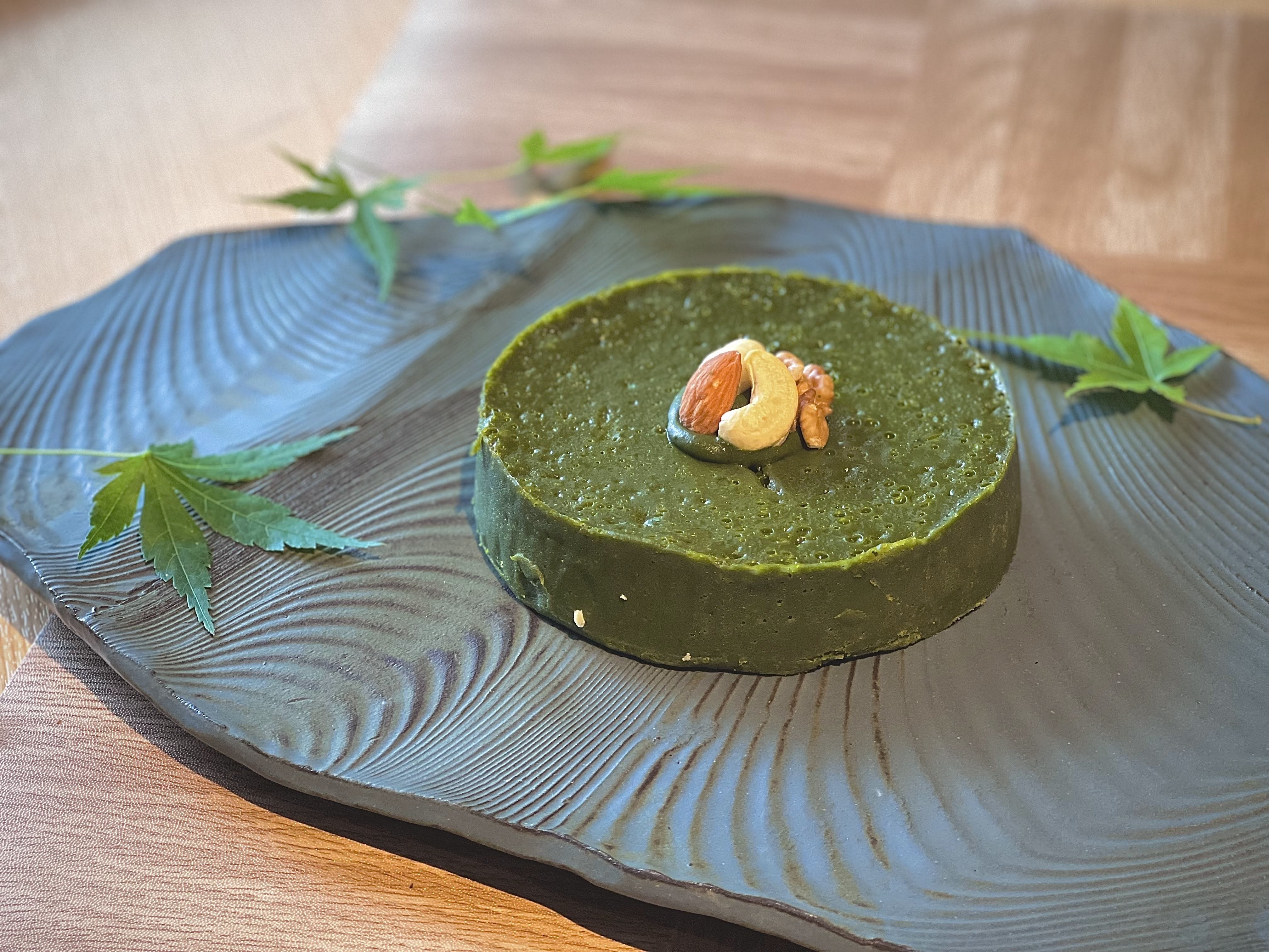 口に含むと、ひやりとなめらかなケーキの肌が舌に触れ、そのまま熱でとろりと溶けていく。濃厚な味わいの最後、鼻に抜けるお茶の香りとのハーモニーをお楽しみください。