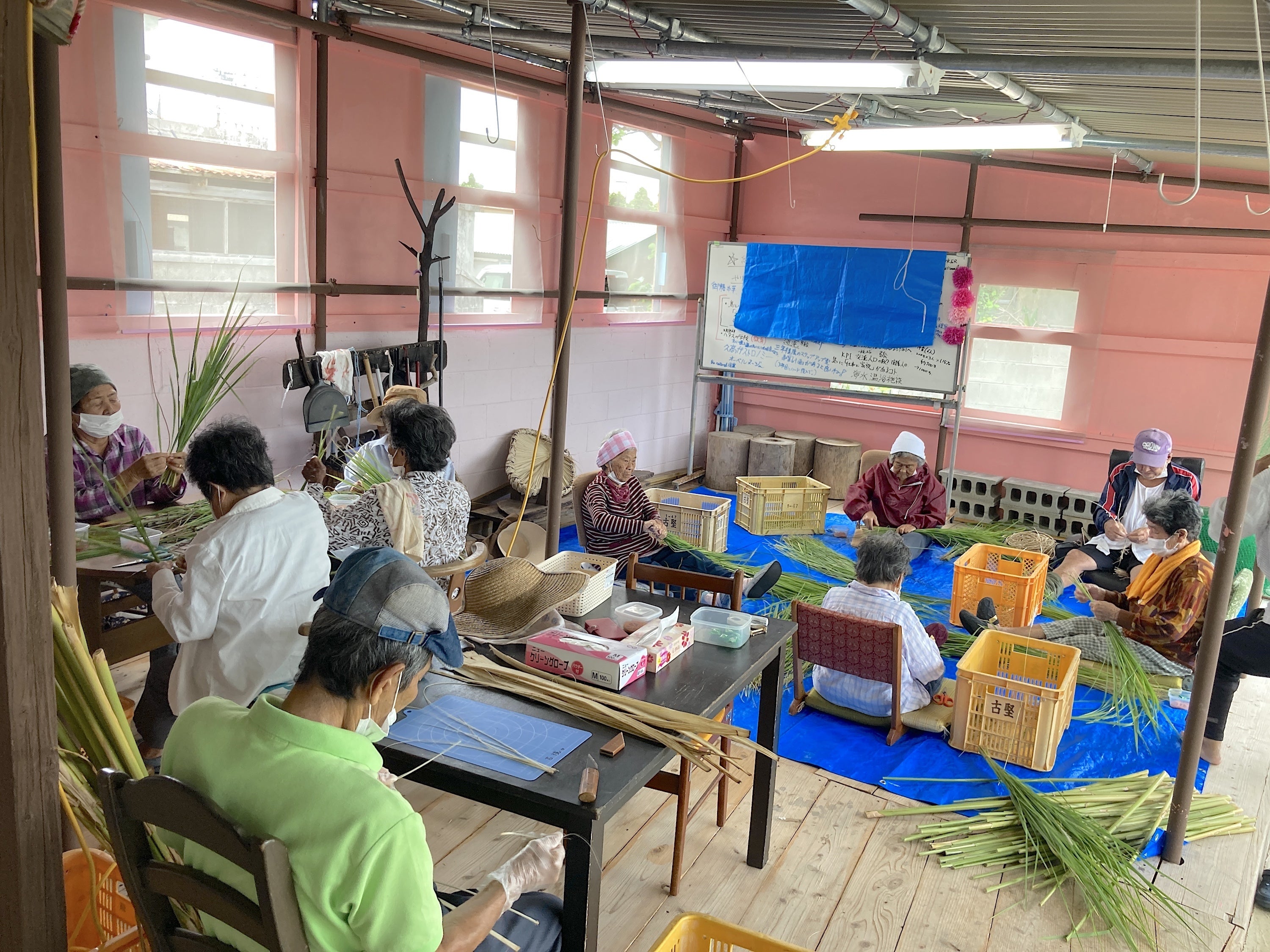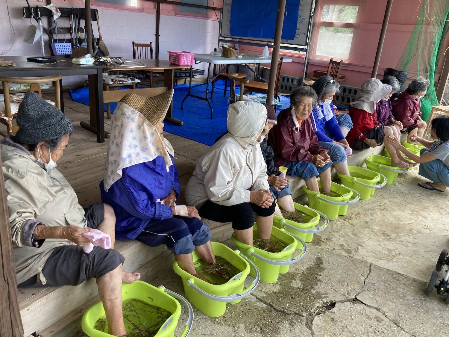 高齢者が集まり作業をするひととき、ユンタク(おしゃべり)をしながら手を動かし、昔話にも花が咲きます。普段はひとり物静かに暮らすおばあたちも、古い時間を共有した仲間同志が集えば、もう忘れていたような記憶がふっとよみがえるのか、民俗資料的にも貴重な話が飛び出したり、時には、身内や家族にも言えなかったような気持ちの話がほろっと出たりもします。作業終わりには、海水を汲んで温め、月桃やヨモギなど島の薬草ハーブをいれた足湯で体を癒してもらいます。何十年も農作業や下働きをしてきた足腰や膝は冷えて痛みを抱えているのです。「ハー、ヌチグスイ(命の薬)さー。毎週一回、ここに来るのが何より楽しみサー。前の夜からもうわくわくしているヨー」とおばあたちの嬉しそうな笑顔は、麦穂のふがに(黄金)の実りそのもの、日焼けした顔や手に刻まれた深いシワは美しい人生の年輪そのものです。島の人々は海水のもつ力を昔から知っている
