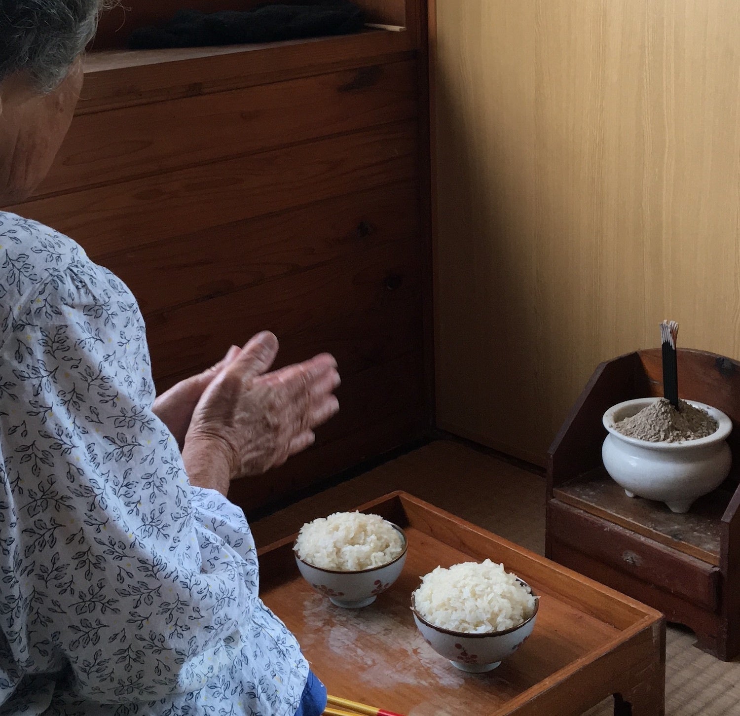 そして、神女を退役したおばあたちは、今でも毎朝と夕方の祈りを365日、欠かしません。朝は、湯飲み3つにいれたお茶を台所にある〝ヒヌカン〟(=陽の神、火の神。香炉などが置かれ宇宙創造神・太陽神につながり、家庭の守護を祈る)に向かって供え、家族の健康、島の安寧、国の安泰、世界の平和を祈ります。夕方には、同じようにして今日一日の無事への感謝の手を合せます。