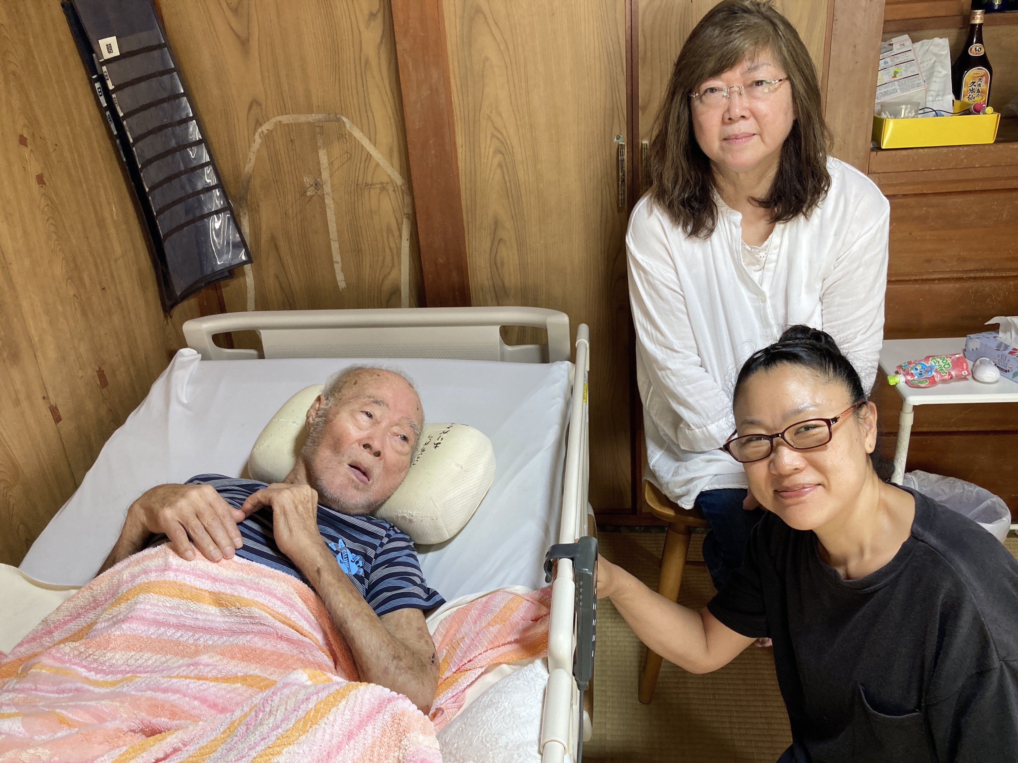 島で唯一の介護士、福島直美さん(右下)と家族の介護のもと島で余生を過ごす内間さん(左)と本島から通う娘さん(右上)