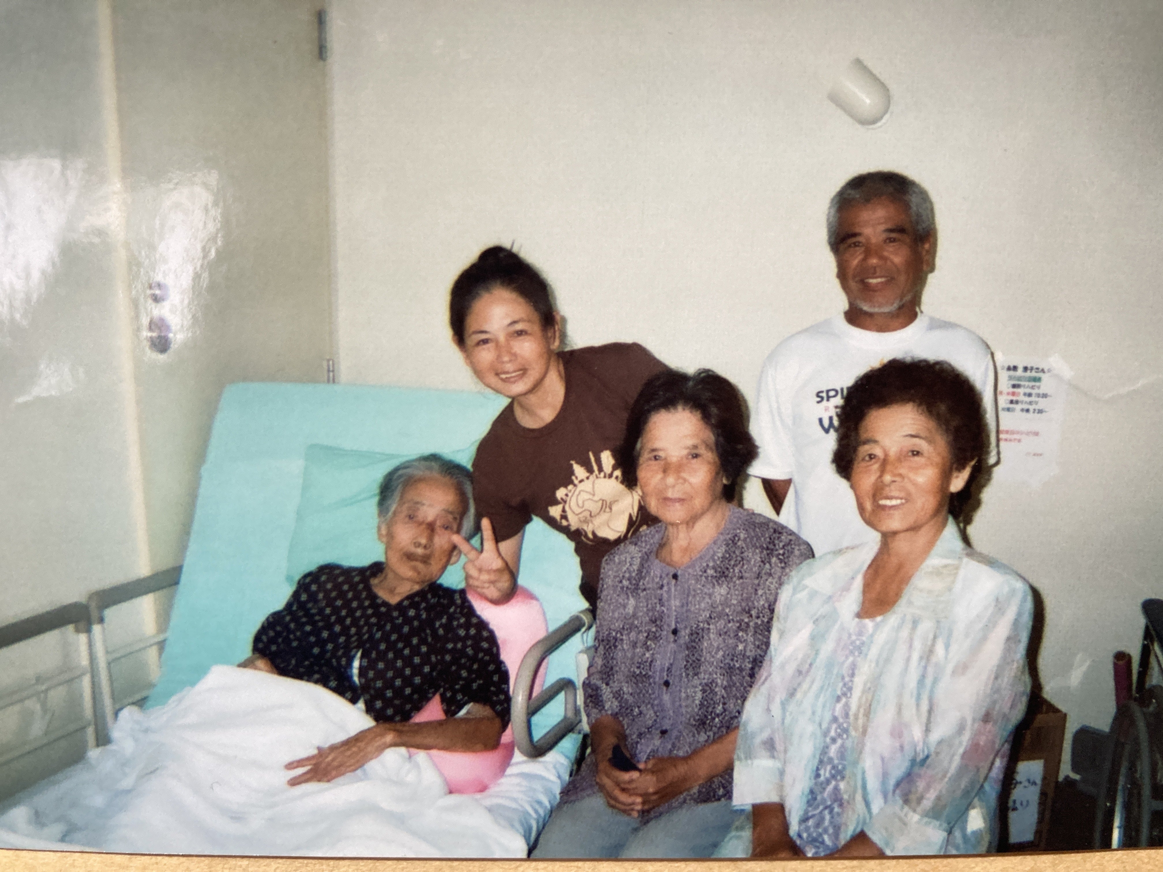 本島の介護施設で母・糸数澄子さん(下列左)とナビィさん(上列左)。ご主人(上列右)やご主人のお母さん(下列真ん中)と久高島で暮らすお姉さんの洋子さん(下列右)とともに。『私の母は、90歳まで島で元気に暮らしていた女性で、もちろんイザイホーにも参加していましたよ。90歳を超えて病気になり、島外の病院で治療を受け、その後も本島の老人ホームで暮らすようになり94歳でニラーハナー(天国)へ旅立ちました。人を困らせることは、絶対に言わない人でしたので、ひと言も〝島に帰りたい〟と口にしたことはありませんでした。ただ、昔からずっと一緒にイラブー(久高島特産の海へび)獲りに行っていた、島に残る友達のことを気にして口にはしていました。心の中ではずっと島に帰りたいと思っていたんだろうなあと思います。病院に入り、初めておむつをした時、〝ボーボー(赤ちゃん)なってるサー〟と恥ずかしそうに言っていた母の顔が思い出されます。家族やまわりを困らせることを知っているから、島のお年寄りは遠慮してなかなか口に出さないことも多いのです。』