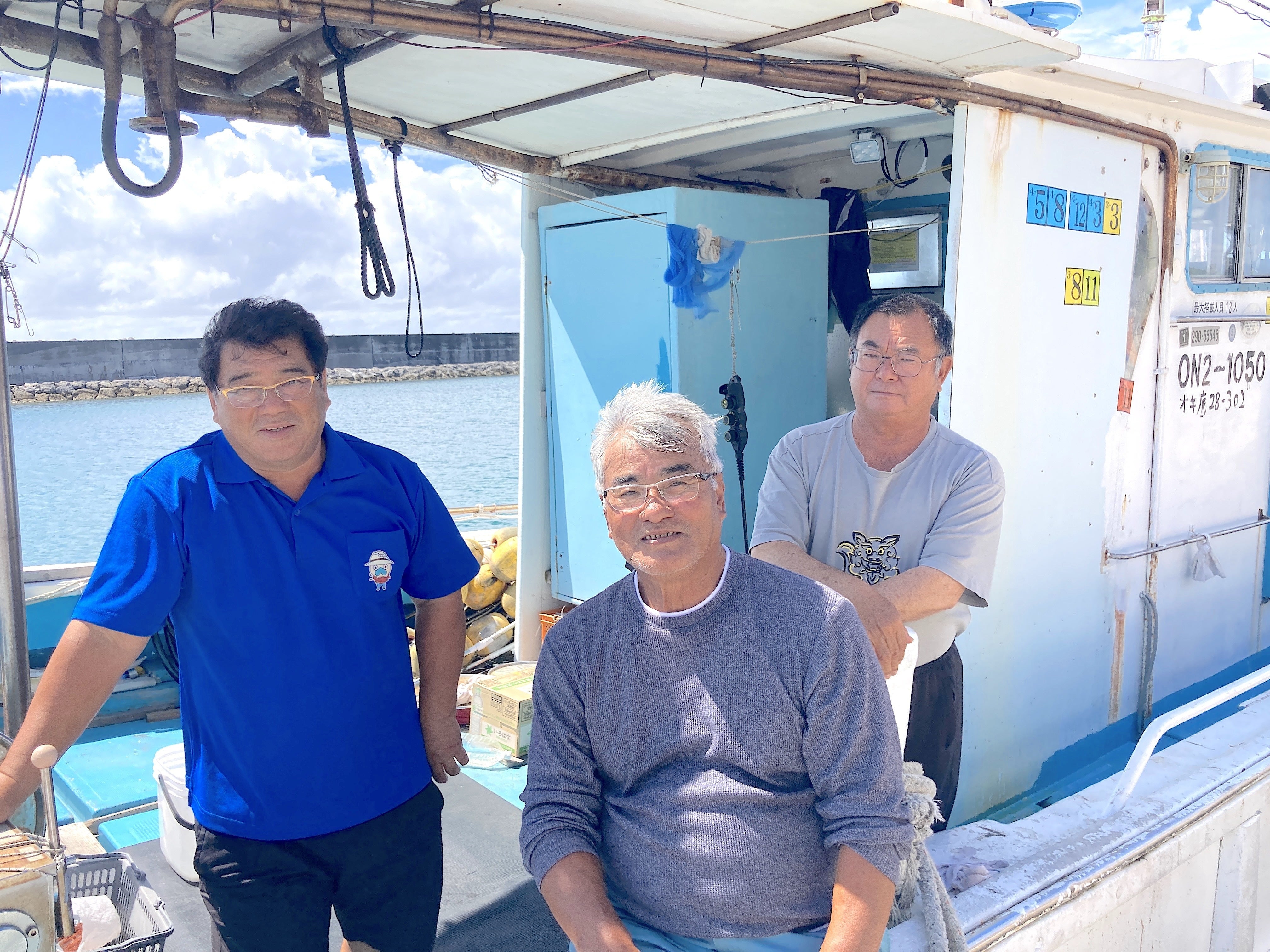 一般社団法人くだか島建て会の外間長裕代表理事(真ん中)、内間学理事(左)、西銘喜久理事(右)。みんな世界の海をまたにかけるウミンチュでもあります!今から50年前、久高小中学校生には約130名の子供たちが学び、島の人口も300人前後でにぎわっていました。そして、その時代の高齢者は家で家族に看取られて天国へ旅立って行きました。それが、私が30年前、島へUターンした時には、小中学校の生徒は10人しかおらず、島は過疎化の道をたどっていました。高齢化も進み、特に一人暮らしの高齢者は、沖縄本島の老人施設へ入居すると二度と生きて島に帰ることはなく、白い小さな箱に入って帰ってきました。納骨を島で迎え入れるお年寄りの口からは、「島に老人ホームがあれば、死ぬまで島で暮らしたい」という声をよく聞きました。島のお年寄りの気持ちをくみ、平成13年度には、小規模多機能事業の立ち上げのためのワーキンググループでの検討も行われましたが、当時、事業に必要な免許保持者が島にはおらず、断念せざるを得ませんでした。しかし、今回は、必要資格もあり、平成28年度の『久高島総合計画』において、小規模多機能事業を再度、構築し、事業へ向けてのワーキンググループも検討を重ねてきた結果、昨年、ついに念願の指定地域密着型サービス事業所の仮指定を受けることができました。島では、一般社団法人くだか島建て会を立ち上げ、小規模多機能型居宅介護事業『ふがに家』の開所へ向けて急ピッチで取り組んでおります。どうぞ、この最後のとりでとなる施設のオープンへ向けて、皆様のお力添えを賜りたくご協力を心よりお願い申し上げます。(西銘喜久)