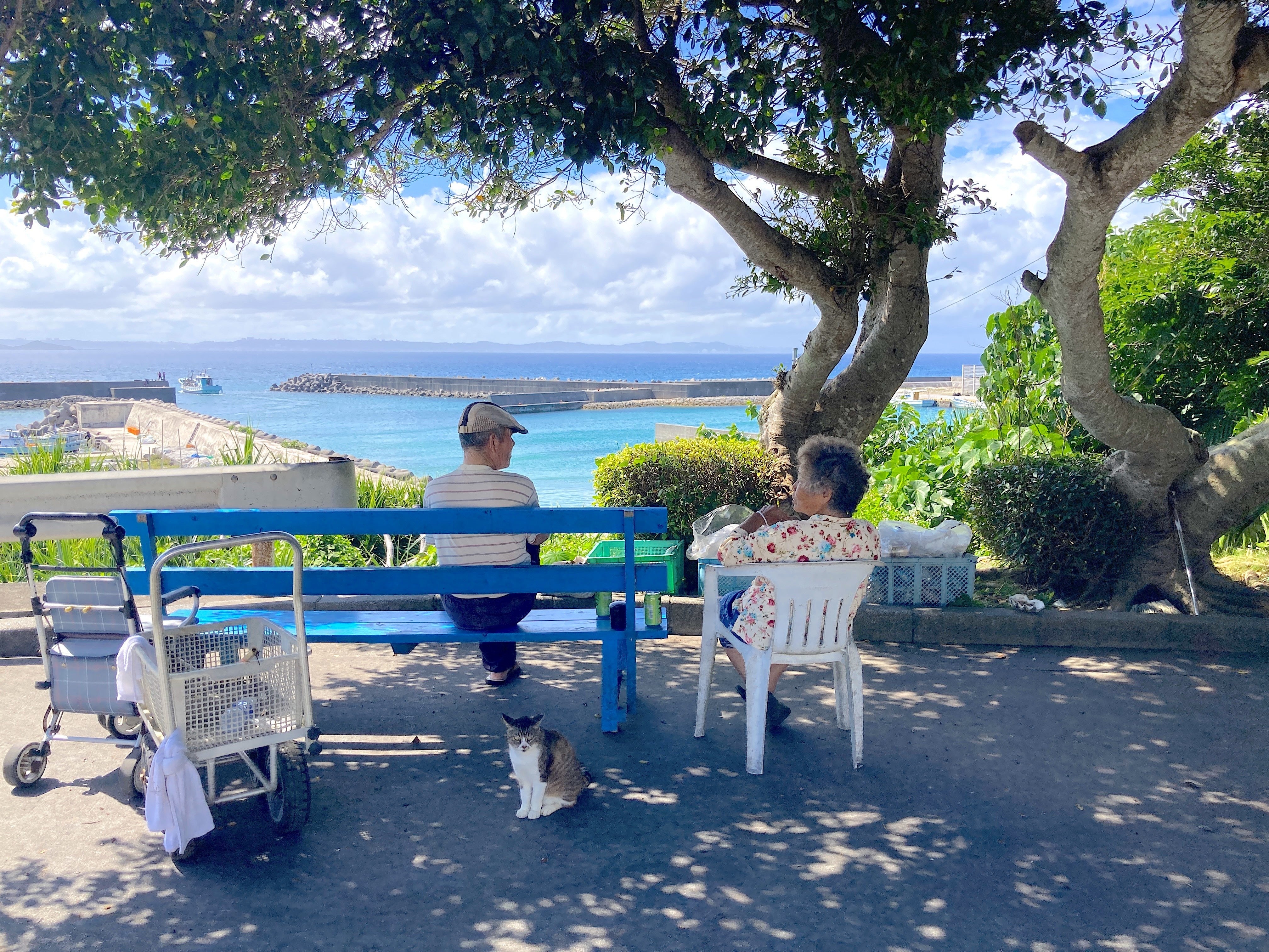 午後のひととき、港の見えるこのベンチの木陰にはいつも島のお年寄りが集う一日の時間軸の中で、お年寄りの時間はたっぷりと余るほどゆっくりと流れています。