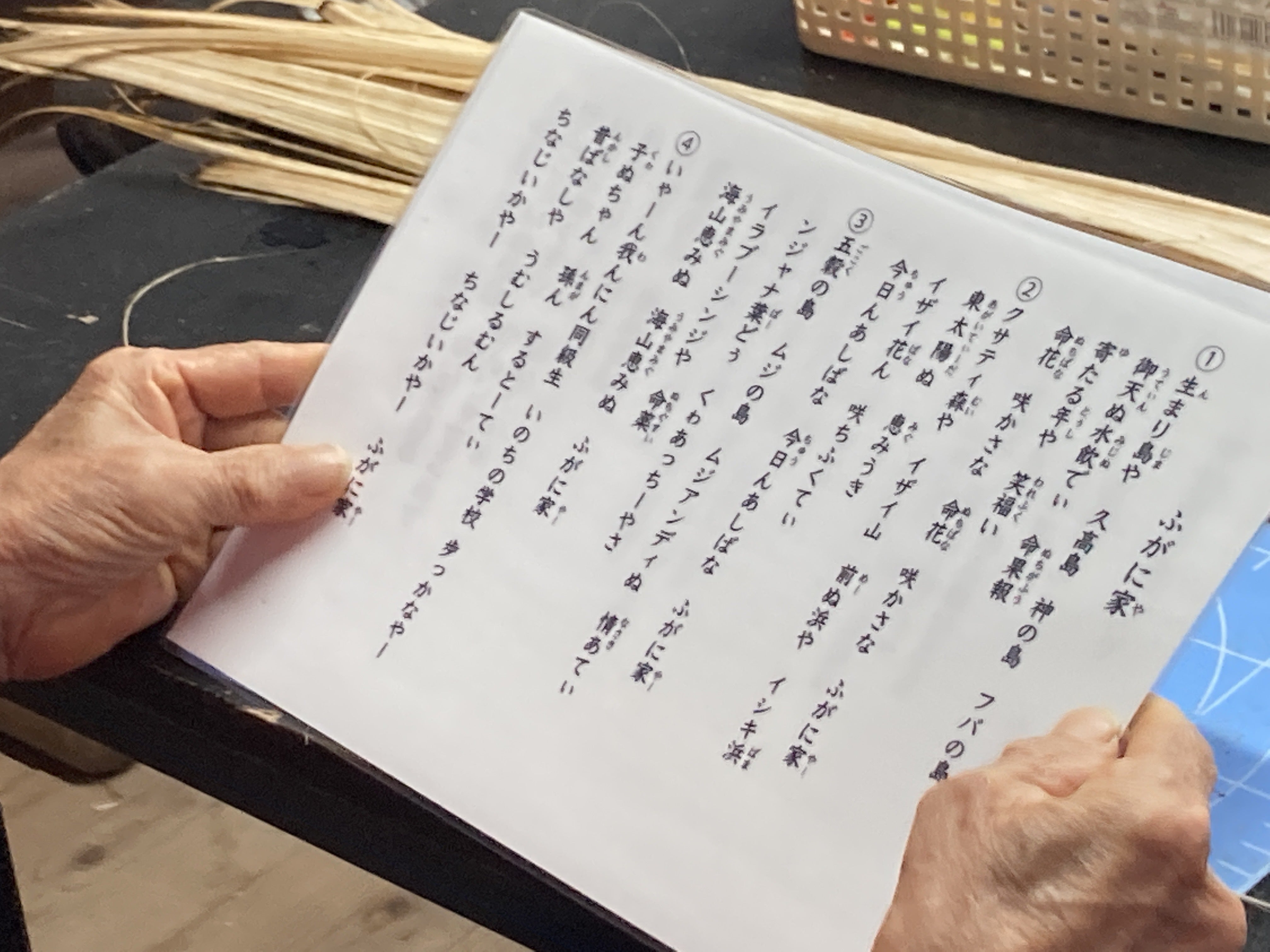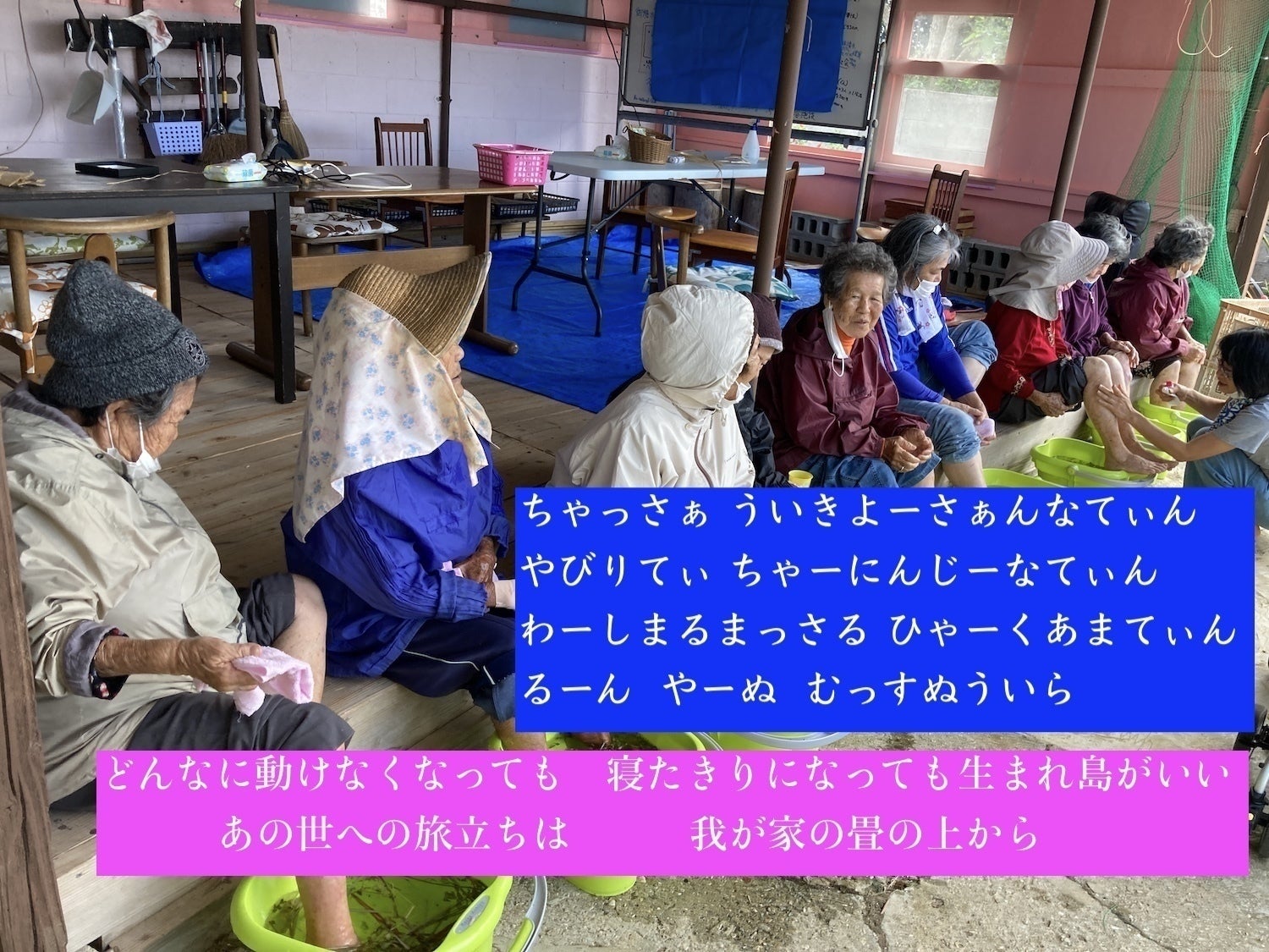 『ちゃっさぁういきよーさぁんなてぃん やびりてぃ ちゃーにんじーなてぃん わーしまるまっさる ひゃーくあまてぃん るーん やーぬ むっすぬういら』(どんなに動けなくなっても寝たきりになっても生まれ島がいい。あの世への旅立ちは我が家の畳の上から)〜〝ふがに家〟理念〜