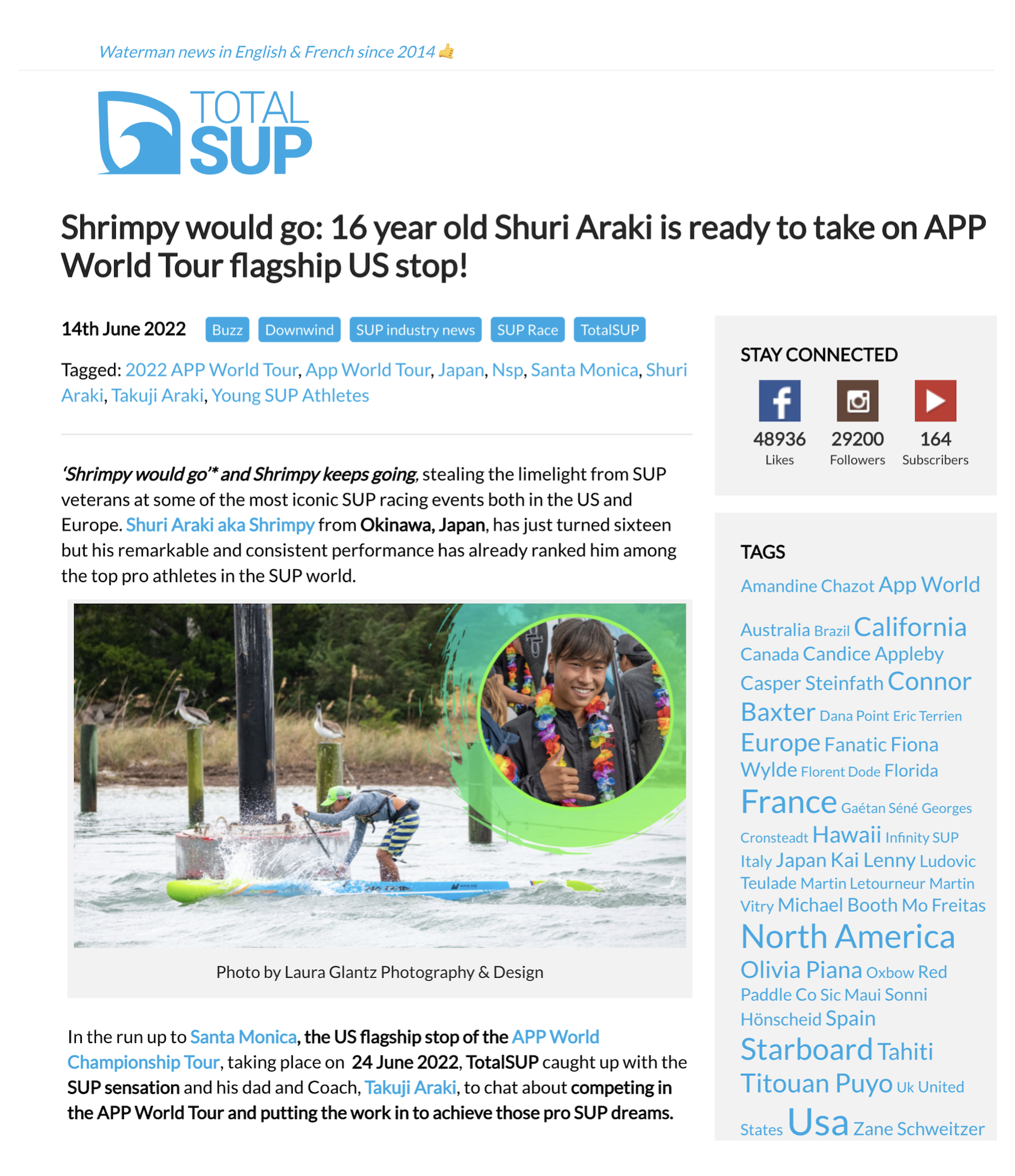 先日、海外で最も人気がある海外サイト「Total SUP」にて特集されました。→ https://www.totalsup.com/news/shuri-shrimpy-araki-app-world-tour-young-sup-athletes-nsp/このサイトは初心者から上級者まで、誰もが気軽にSUPのことを知ることができる情報サイトで、世界で最も詳しく、正確な情報を発信していることで有名です。スペインのレース直後に、インタビューを受けましたが、僕のこれまでの国内外のレースの成績をしっかりと調べてくれた上でちゃんと質問を考えてきてくれていることがよくわかりました。英語のサイトですが、是非読んでいただけたら嬉しいです。僕が幼少の頃からどのように海に漕ぎ出していったか?将来の夢、家族と海との向き合い方、学校生活とのバランス、など。いろんな角度から質問を受けましたので読んでいただけたら嬉しいです。そしてこの英文を僕が小さい時からお世話になっている恭平さんが翻訳してくれました。海外での活躍を少しでも日本人の方々に知ってもらうためには、どうしても英語文だけでは難しいので本当にありがたい事です。恭平さん、いつもありがとうございます!!「Shrimpy would go (シュリンピーなら行くだろう*)」、そしてシュリンピーは進化し続け、アメリカとヨーロッパの最も有名なSUPレースで、ベテラン選手から脚光を浴び続けている。「シュリンピー」として知られる荒木珠里は、日本の沖縄出身で16歳になったばかりだが、安定した高いパフォーマンスで、すでにSUP界のトッププロアスリートの仲間入りを果たしている。*ハワイの伝説ビッグウェーブサーファー、ウォーターマン、ライフガードであるエディ・アイカウを讃えた「Eddie Would Go」という言葉をなぞっている。2022年6月24日に開催されるAPPワールドチャンピオンシップツアー、サンタモニカ大会(米国の旗艦大会)に向けて、TotalSUPはSUP界の一大センセーションである彼と、父親でコーチの荒木汰久治にインタビューを行い、APPワールドツアーに参戦する意味やSUPのプロパドラーという夢にむけた努力について話を聞いた。やあ、珠里。TotalSUPにようこそ!本当に、何て素晴らしいシーズンスタートだろう!本当におめでとう。まず初めに、スタンドアップパドルボードを始めたきっかけを教えてくれるかな?僕にとってSUPは、最初からスポーツというより生活の一部(ライフスタイル)でした。SUPボードから魚網を投げて、小さなリーフフィッシュを釣っていました。僕の家は海辺にあり、周りには魚がたくさんいます。8歳になる妹も僕と同じ魚網や、父とのタンデムサーフィンで遊んでいます。僕はSUPの中でもダウンウィンドが好きで、フォイルも大好きです。8歳のときに父と一緒にダウンウィンドを始め、すぐにハマりました。沖縄は日本の南西に位置し、一年中温暖な南国なので、ダウンウィンドのスポットがたくさんあります。私は年間100日以上、SUPかフォイルでダウンウィンドをしています。ダウンウィンドでのパドリングは、バランス感覚や敏捷性に役立つと思いますし、何よりいつもとても楽しいです。時には危険なこともありますが、水面に立ったり、水面を飛んでいると、最高に美しい海の景色を見ることができるんですよ!父・汰久治は言う。「私は、珠里のことを出来る限りサポートしたいと思ってます。彼はただ世界最高峰の選手と一緒にレースができることに喜びを感じているし、外の世界をたくさん見たい思っているだけなんです。珠里は小さい時から沖縄の小さな漁村で育って、今ようやく世界を探検し始めたところなんです。」沖縄のSUPレースやコミュニティはどんな感じですか?僕の漁師一家は、過去10年間、SUPレース(主にダウンウィンド)を開催しています。もちろん、みんなボランティアです。小さい頃は父の友人たちの背中を追いかけていました。今ではこのコミュニティで最も速いパドラーの一人になりました。競争はいつも激しいですが楽しくレースをしています。(この夏は沖縄〜与論の海峡を渡るレースを計画中です)スタンドアップ・パドルボードの世界で、あなたに刺激を与えてくれる人は誰ですか?カイ・レニー、キャスパー・スタインファス、コナー・バクスター、マイケル・ブース、ゼーン・ケコア・シュバイツァー、ティトゥアン・プヨ、ダニエル・ハスヨ・・・(現在はノイックも含みます)みんな僕のヒーローです。7歳のとき、日本で開催されたAPPワールドツアーを観戦に行きました。そして、彼らと一緒にレースをすることが僕の夢となり、ついにそれが現実のものとなったのです。SUPレースに向けて、どのような準備をしていますか?父である荒木汰久治は、僕のコーチでもあり、毎日横でパドルしています。彼は過去に35回もモロカイチャレンジ(M2O)に参加していて、どのようなタイプのレースでも、どのように準備すればいいか精通しています。父と一緒に話し合ったことを、細かくノートにまとめることも毎日続けています。学校とトレーニング、そして友人と過ごす時