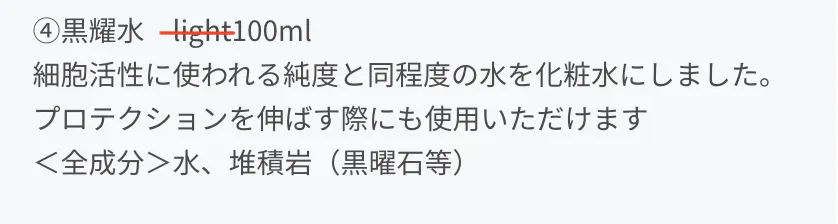 細胞活性に使われる純度と同程度の水に、シルクと黒曜石が入った贅沢な化粧水です。