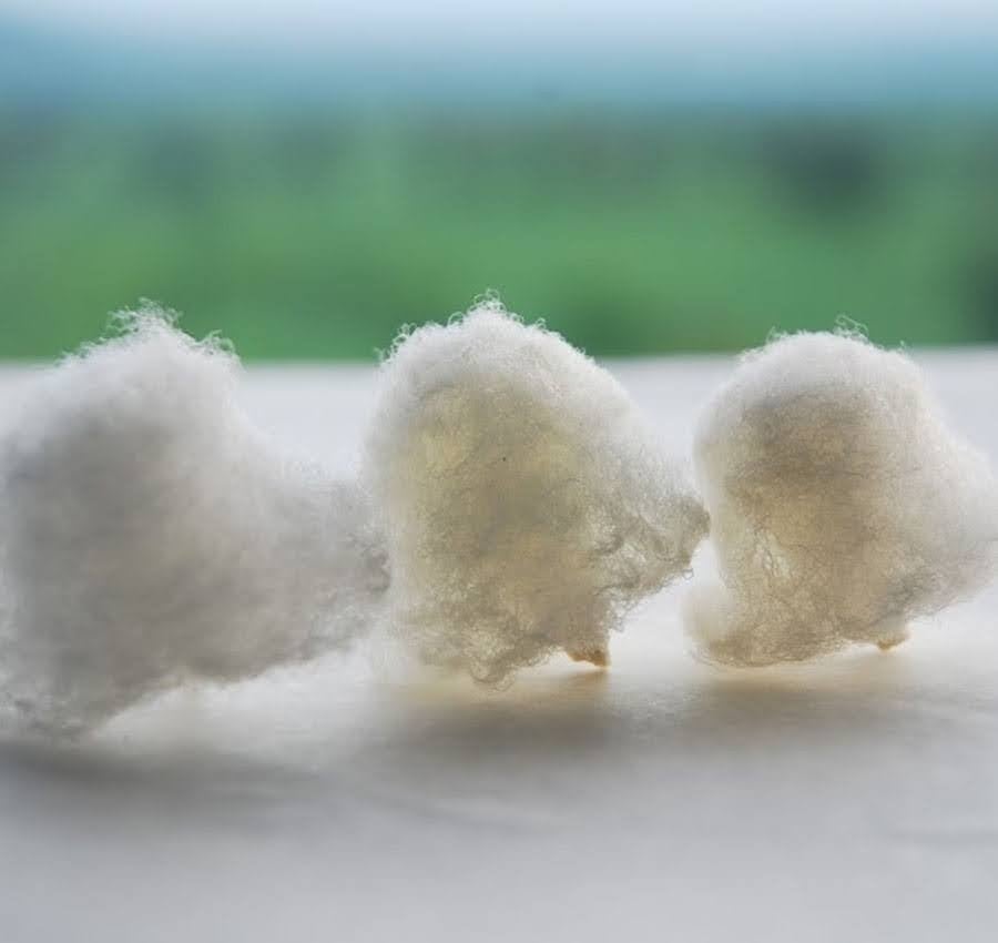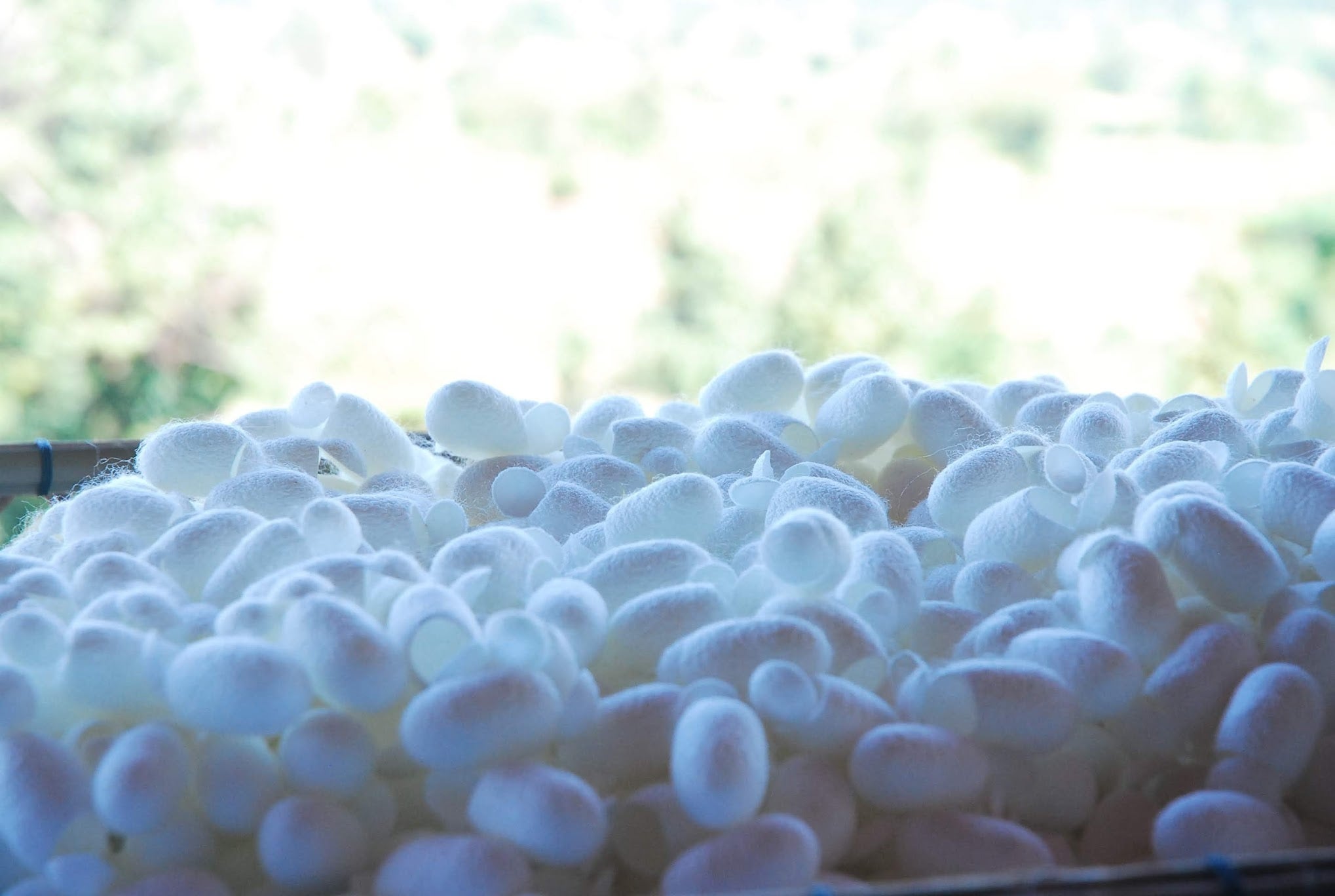 生繭を使う 通常の繭は熱風乾燥されますが、乾燥させることでシルクに与えてしまうダメージを避け、同時に蛹の命を奪いたくないという思いから、中から蛹を生きたまま取り出し、加熱せずに生の繭を使っています。