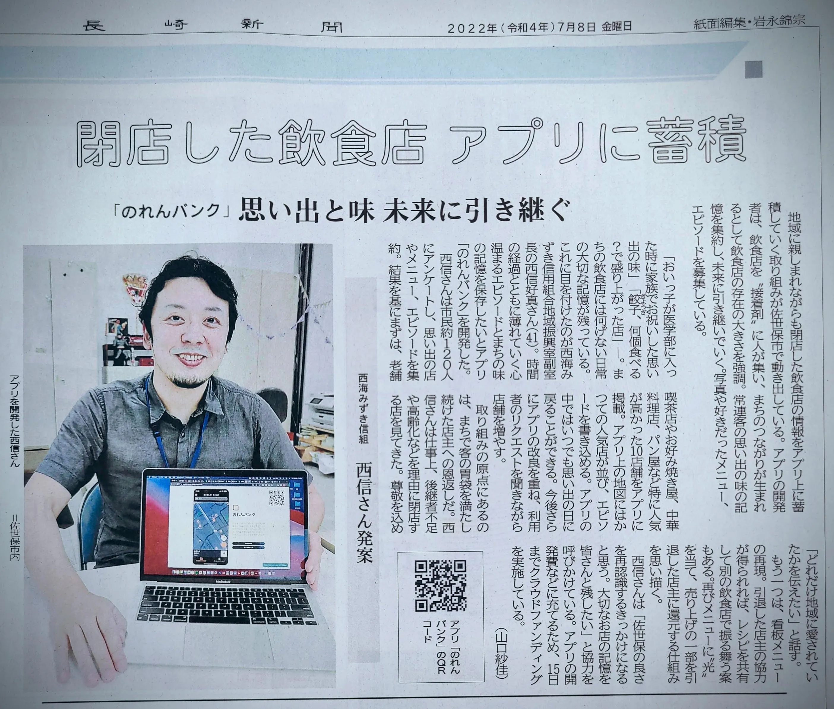 2022/07/12 03:01先日7月8日に、長崎新聞で「のれんバンク」の活動が紹介されました。また同日NBCラジオ様の情報番組「チャージ」で10分ほどの取材を受けました。これから先は、佐世保の閉店した飲食店の思い出や写真、そしてレシピを街の人からの協力をもらいながら集めていく作業が本格化していきます。そうした際に、こうした地元メディアでの紹介内容なども交えて、より多くの地域の人に活動を支援していただけるように動いていければと思っています。まずは、最初の復刻メニューのスタートを目指して、今週より情報収集と取材を進めていきます。進捗あり次第、またこちらに投稿させていただきます。引き続きよろしくお願いいたします! もっと見る
