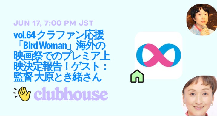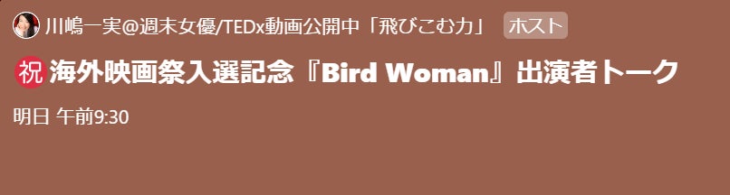 本日6月17日19:00〜20:00まで、痴漢止活動センターの松永弥生さんのお招きにより、Clubhouse roomで、大原とき緒が短編映画『Bird Woman』について語ります。