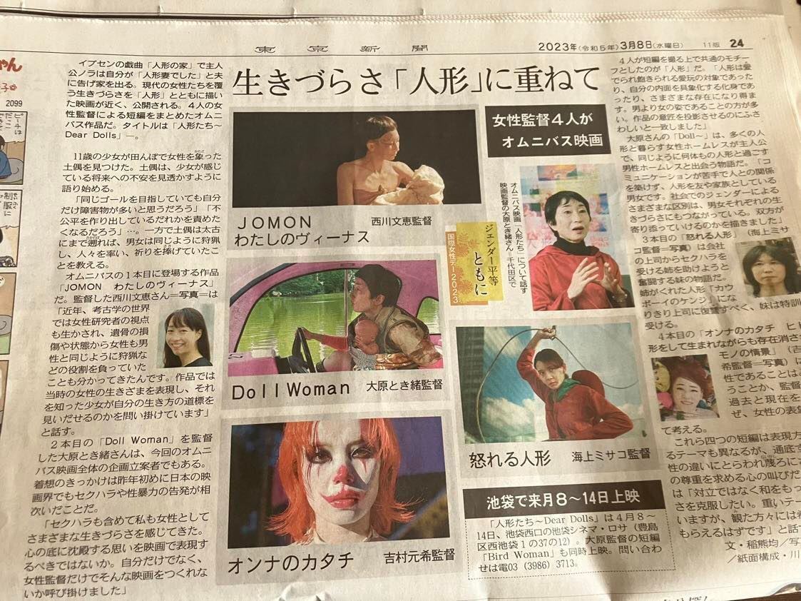 長編オムニバス映画『人形たち~Dear Dolls』(83分)と『Bird Woman』(21分)の同時上映です。私はオムニバス映画の一篇『Doll Woman』の監督もしています。こちらは脚本は『Bird Woman』と同じくヘルチャンが書いております。「人形と生きづらさを感じている女性たち」をテーマにした作品ですが、くすっと笑えるところもあり、観た後には希望を感じる作品になっております。本当に多くの方に観ていただきたい映画だと自負しております。