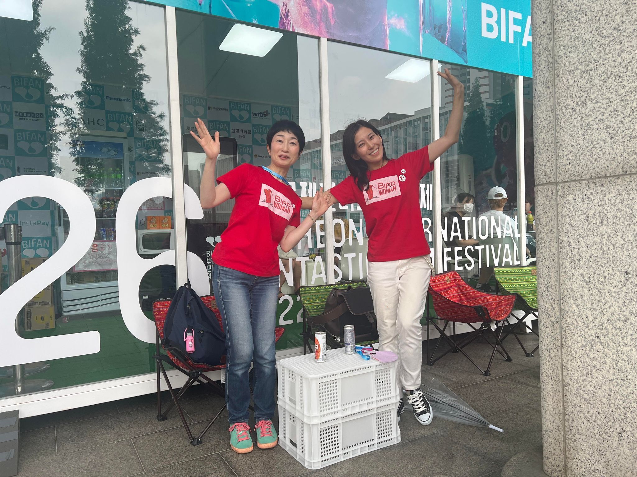 2022年7月韓国のプチョン国際ファンタスティック映画祭にて、いわさききょうこさんと、Tシャツ姿でポストカードをブースに置かせていただいたり宣伝しておりました。