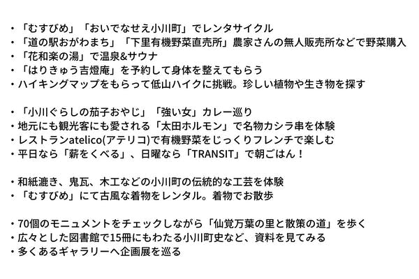 せっかく小川町にきてくださるなら、その日できたてほやほやの小川町の面白さに触れてもらえたらな。事前に持っていたイメージを超える思い出をつくっていただけたらな。まちのあちこちで宿泊者と地元の方との接点が生まれたらな。