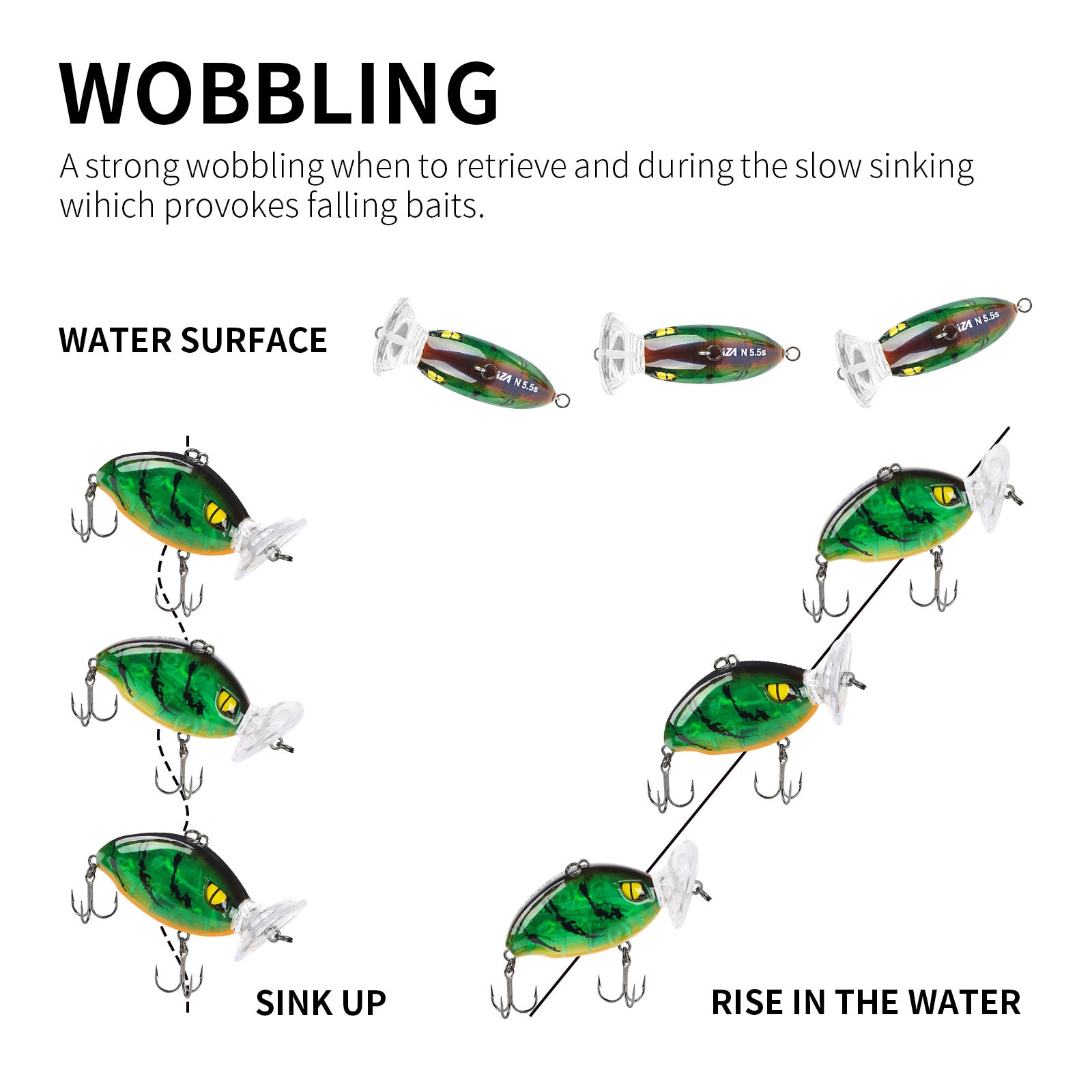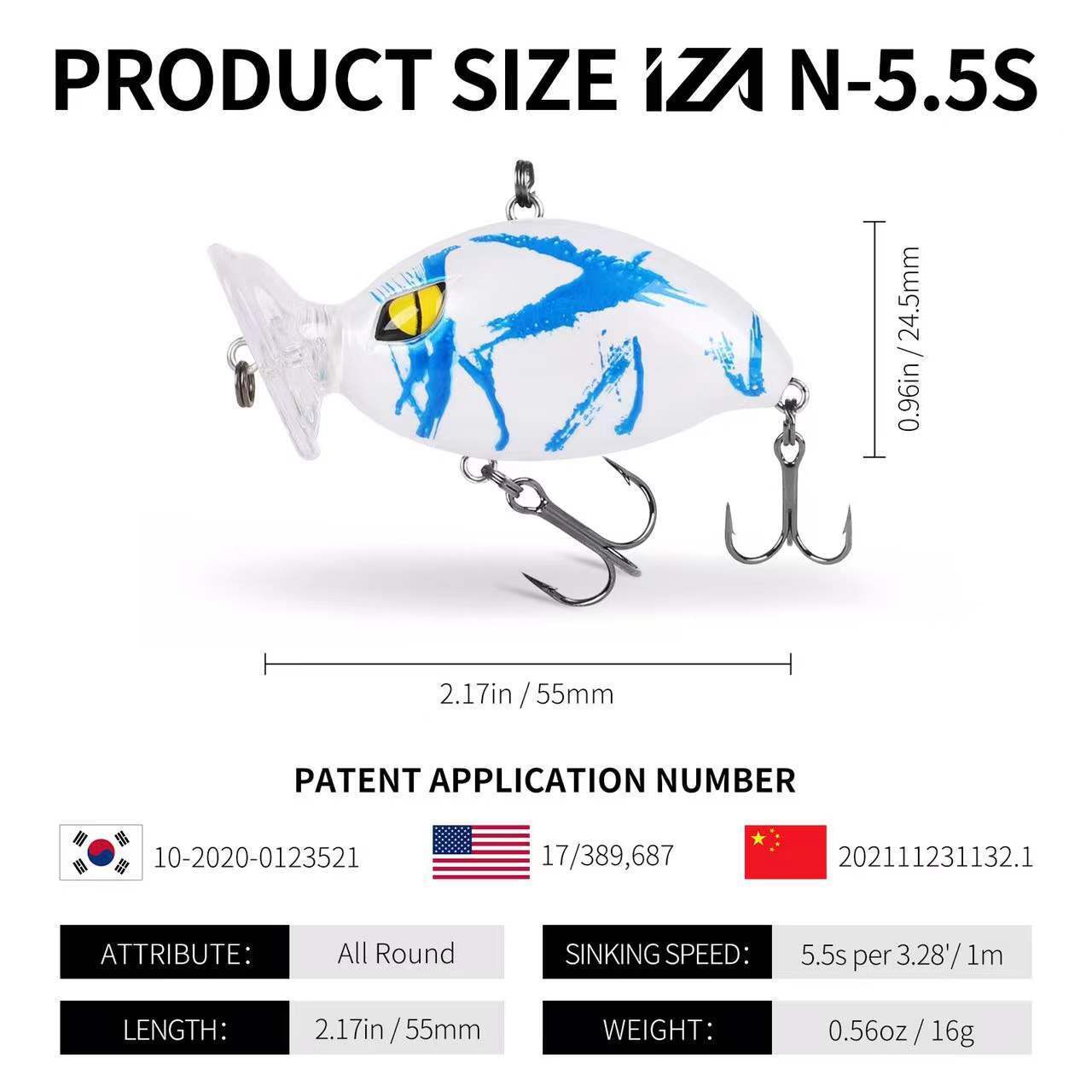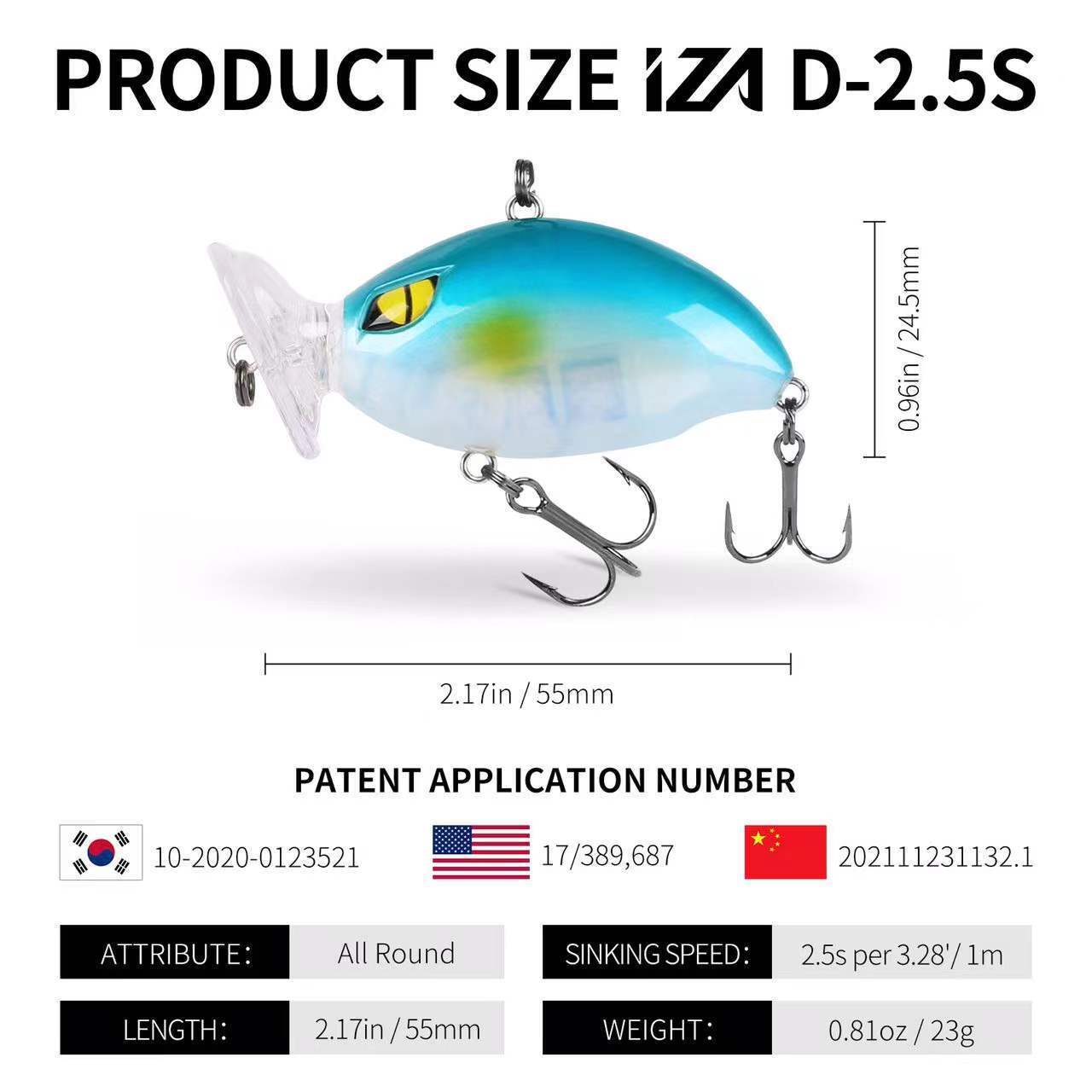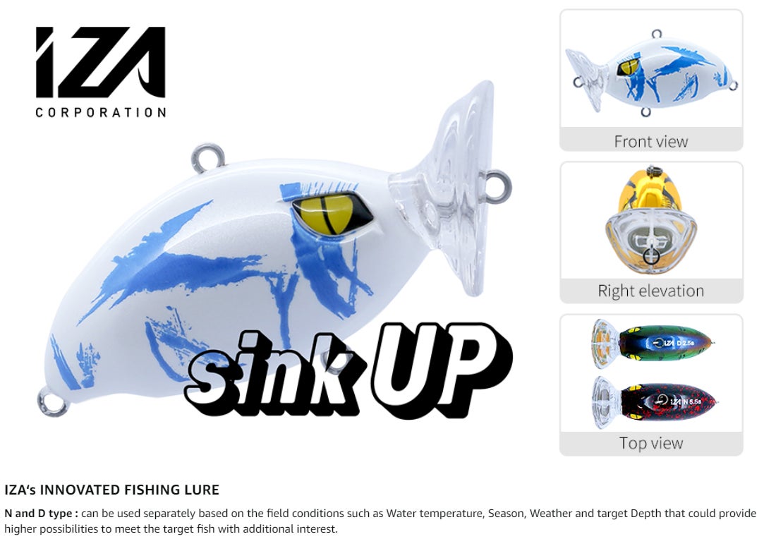 IZA Sink-upルアーは、トップウォーターから底まで共に攻略ができる全天候型釣り用ルアーです。フィールドの状況に応じて2.5sと5.5sの選択をしてください。詳細な操作方法はGIFと映像を参照してください。