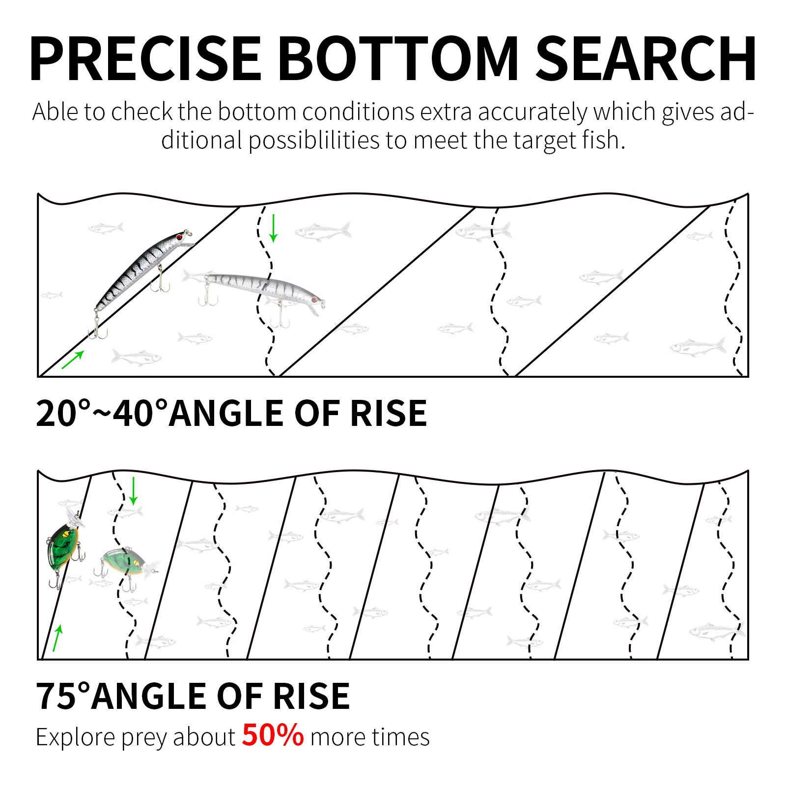 「非常に遅い速度で底圏を効果的に探索できる」 「底掛かりからルアーを最大限保護できる」 「水面と底層を含む全層を全て探索できる」 「底から水面まで高角上昇を達成できる」