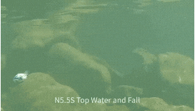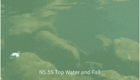 6. 継続的なリトリーブでは上昇する特性を利用しトップウォータールアーとして作用し、止めるとゆっくりと沈みこみ水面下のターゲットを食いつかせます。